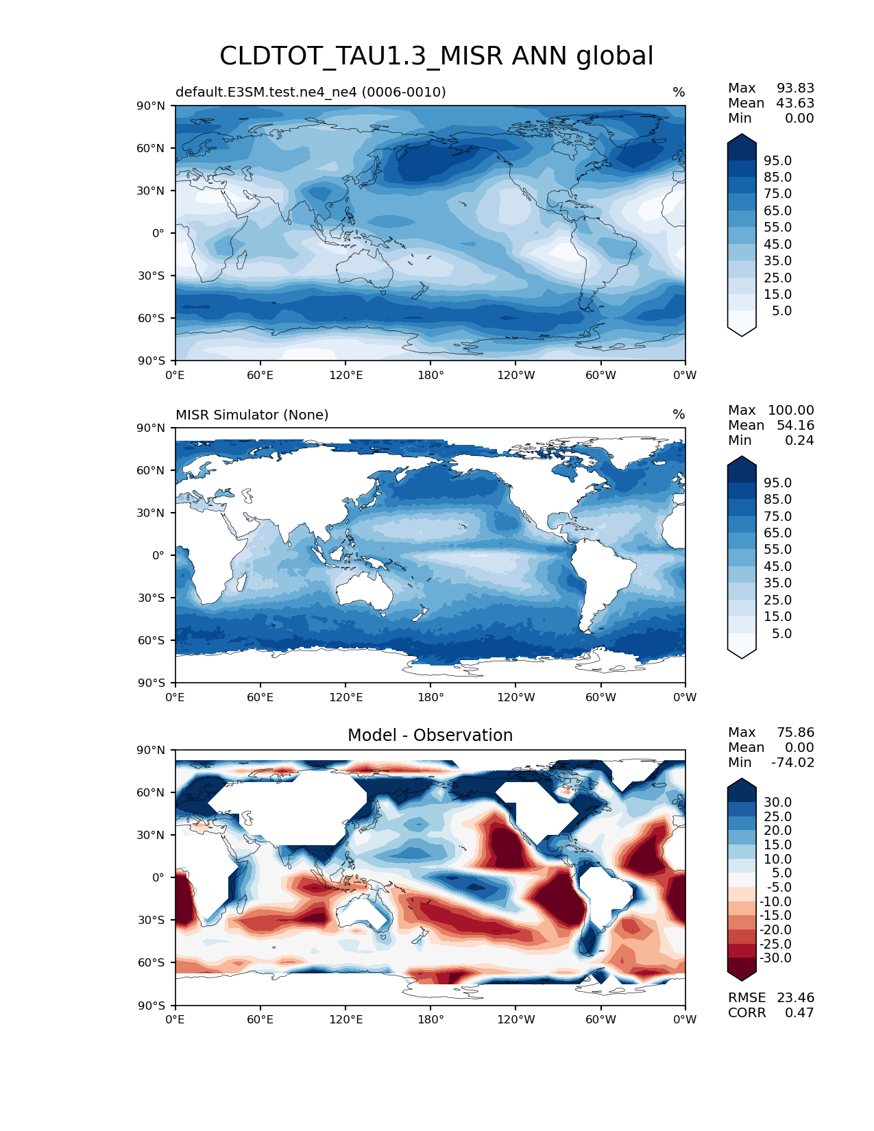Use this command to recreate this image: | e3sm_diags lat_lon --no_viewer --case_id 'Cloud MISR' --sets 'lat_lon' --run_type 'model_vs_obs' --variables 'CLDTOT_TAU1.3_MISR' --seasons 'ANN' --regions 'global' --regrid_tool 'esmf' --regrid_method 'conservative' --main_title 'CLDTOT_TAU1.3_MISR ANN global' --backend 'mpl' --output_format 'png' --canvas_size_w '1212' --canvas_size_h '1628' --figsize '8.5' '11.0' --dpi '150' --arrows --contour_levels '5' '15' '25' '35' '45' '55' '65' '75' '85' '95' --test_name 'default.E3SM.test.ne4_ne4' --test_colormap 'Blues' --ref_name 'MISRCOSP' --reference_name 'MISR Simulator' --reference_colormap 'Blues' --diff_title 'Model - Observation' --diff_colormap 'RdBu' --diff_levels '-30' '-25' '-20' '-15' '-10' '-5' '5' '10' '15' '20' '25' '30' --multiprocessing --num_workers '32' --granulate 'variables' 'seasons' 'plevs' 'regions' --selectors 'sets' 'seasons' --reference_data_path '/global/cfs/cdirs/e3sm/acme_diags/obs_for_e3sm_diags/climatology/' --test_data_path '/global/cscratch1/sd/wagmanbe/e3sm_climo/default.E3SM.test.ne4_ne4/0006-0010/' --results_dir '/global/cfs/cdirs/e3sm/www/wagmanbe/ne4_test/0006-0010' |