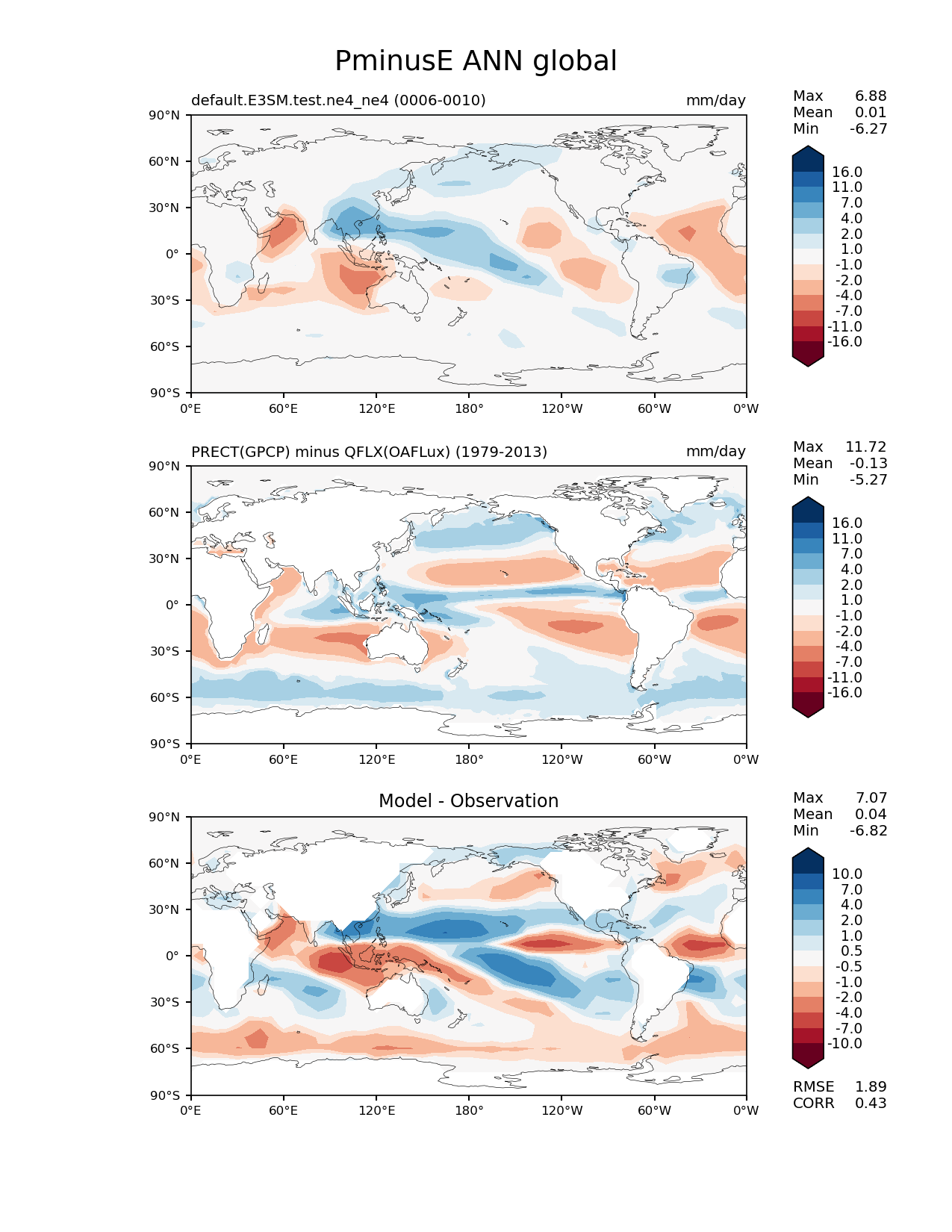 Use this command to recreate this image: | e3sm_diags lat_lon --no_viewer --case_id 'GPCP_OAFLux' --sets 'lat_lon' --run_type 'model_vs_obs' --variables 'PminusE' --seasons 'ANN' --regions 'global' --regrid_tool 'esmf' --regrid_method 'conservative' --main_title 'PminusE ANN global' --backend 'mpl' --output_format 'png' --canvas_size_w '1212' --canvas_size_h '1628' --figsize '8.5' '11.0' --dpi '150' --arrows --contour_levels '-16' '-11' '-7' '-4' '-2' '-1' '1' '2' '4' '7' '11' '16' --test_name 'default.E3SM.test.ne4_ne4' --test_colormap 'RdBu' --ref_name 'GPCP_OAFLux' --reference_name 'PRECT(GPCP) minus QFLX(OAFLux)' --reference_colormap 'RdBu' --diff_title 'Model - Observation' --diff_colormap 'RdBu' --diff_levels '-10' '-7' '-4' '-2' '-1' '-0.5' '0.5' '1' '2' '4' '7' '10' --multiprocessing --num_workers '32' --granulate 'variables' 'seasons' 'plevs' 'regions' --selectors 'sets' 'seasons' --reference_data_path '/global/cfs/cdirs/e3sm/acme_diags/obs_for_e3sm_diags/climatology/' --test_data_path '/global/cscratch1/sd/wagmanbe/e3sm_climo/default.E3SM.test.ne4_ne4/0006-0010/' --results_dir '/global/cfs/cdirs/e3sm/www/wagmanbe/ne4_test/0006-0010' |