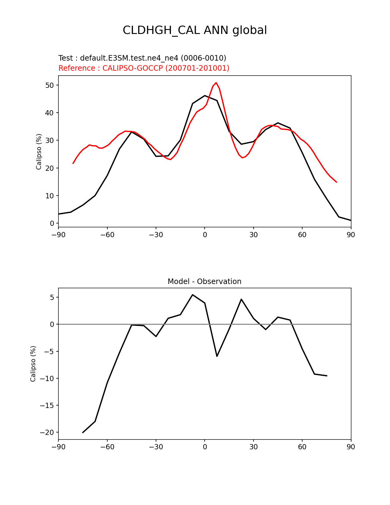 Use this command to recreate this image: | e3sm_diags zonal_mean_xy --no_viewer --case_id 'Cloud Calipso' --sets 'zonal_mean_xy' --run_type 'model_vs_obs' --variables 'CLDHGH_CAL' --seasons 'ANN' --regions 'global' --regrid_tool 'esmf' --regrid_method 'conservative' --main_title 'CLDHGH_CAL ANN global' --backend 'mpl' --output_format 'png' --canvas_size_w '1212' --canvas_size_h '1628' --figsize '8.5' '11.0' --dpi '150' --arrows --test_name 'default.E3SM.test.ne4_ne4' --test_colormap 'cet_rainbow.rgb' --ref_name 'CALIPSOCOSP' --reference_name 'CALIPSO-GOCCP' --reference_colormap 'cet_rainbow.rgb' --diff_title 'Model - Observation' --diff_colormap 'diverging_bwr.rgb' --multiprocessing --num_workers '32' --granulate 'variables' 'seasons' 'plevs' 'regions' --selectors 'sets' 'seasons' --reference_data_path '/global/cfs/cdirs/e3sm/acme_diags/obs_for_e3sm_diags/climatology/' --test_data_path '/global/cscratch1/sd/wagmanbe/e3sm_climo/default.E3SM.test.ne4_ne4/0006-0010/' --results_dir '/global/cfs/cdirs/e3sm/www/wagmanbe/ne4_test/0006-0010' |