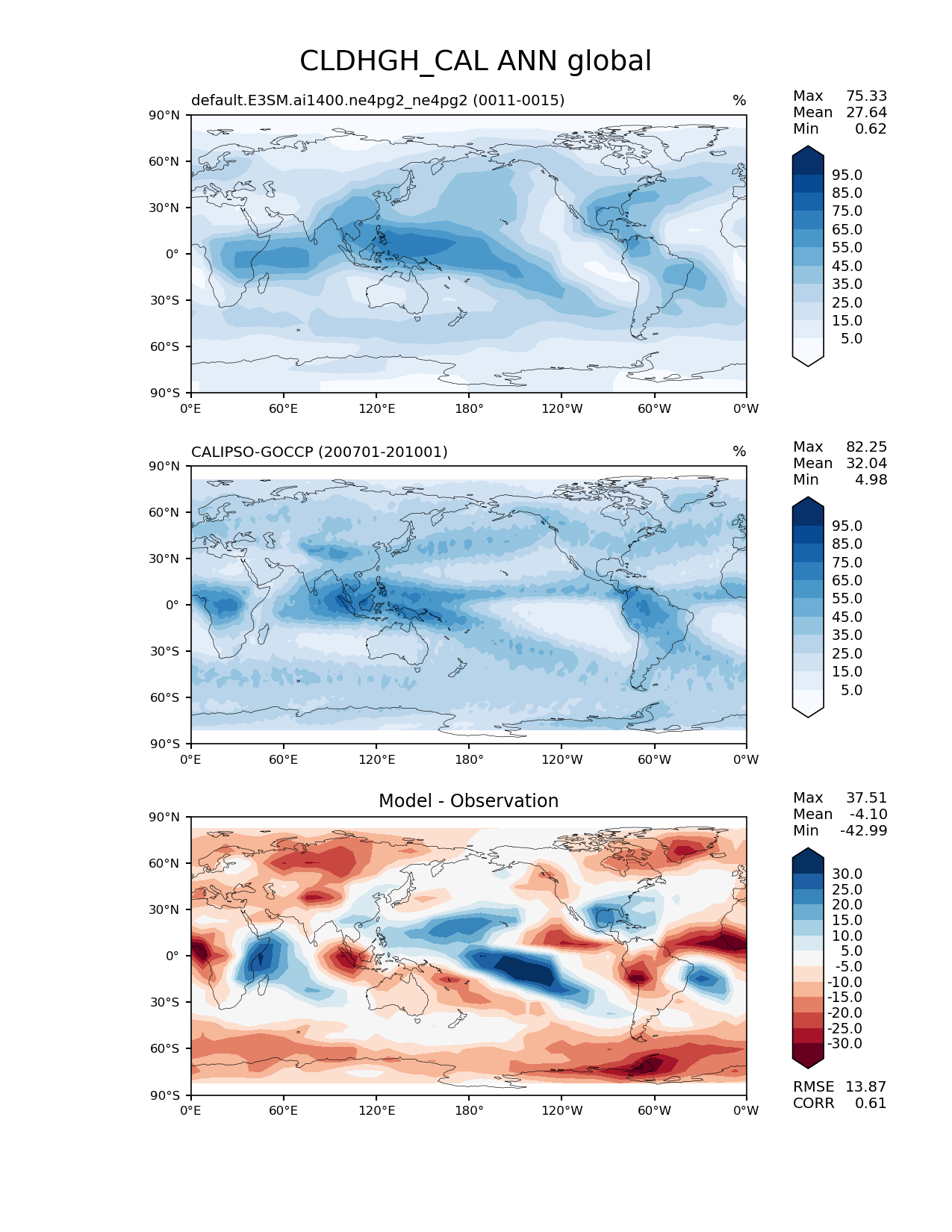 Use this command to recreate this image: | e3sm_diags lat_lon --no_viewer --case_id 'Cloud Calipso' --sets 'lat_lon' --run_type 'model_vs_obs' --variables 'CLDHGH_CAL' --seasons 'ANN' --regions 'global' --regrid_tool 'esmf' --regrid_method 'conservative' --main_title 'CLDHGH_CAL ANN global' --backend 'mpl' --output_format 'png' --canvas_size_w '1212' --canvas_size_h '1628' --figsize '8.5' '11.0' --dpi '150' --arrows --contour_levels '5' '15' '25' '35' '45' '55' '65' '75' '85' '95' --test_name 'default.E3SM.ai1400.ne4pg2_ne4pg2' --test_colormap 'Blues' --ref_name 'CALIPSOCOSP' --reference_name 'CALIPSO-GOCCP' --reference_colormap 'Blues' --diff_title 'Model - Observation' --diff_colormap 'RdBu' --diff_levels '-30' '-25' '-20' '-15' '-10' '-5' '5' '10' '15' '20' '25' '30' --multiprocessing --num_workers '32' --granulate 'variables' 'seasons' 'plevs' 'regions' --selectors 'sets' 'seasons' --reference_data_path '/global/cfs/cdirs/e3sm/acme_diags/obs_for_e3sm_diags/climatology/' --test_data_path '/global/cfs/cdirs/e3sm/emulate/postproc_e3sm/slice/default.E3SM.ai1400.ne4pg2_ne4pg2' --results_dir '/global/cfs/cdirs/e3sm/www/wagmanbe/slice/default.E3SM.ai1400.ne4pg2_ne4pg2' |