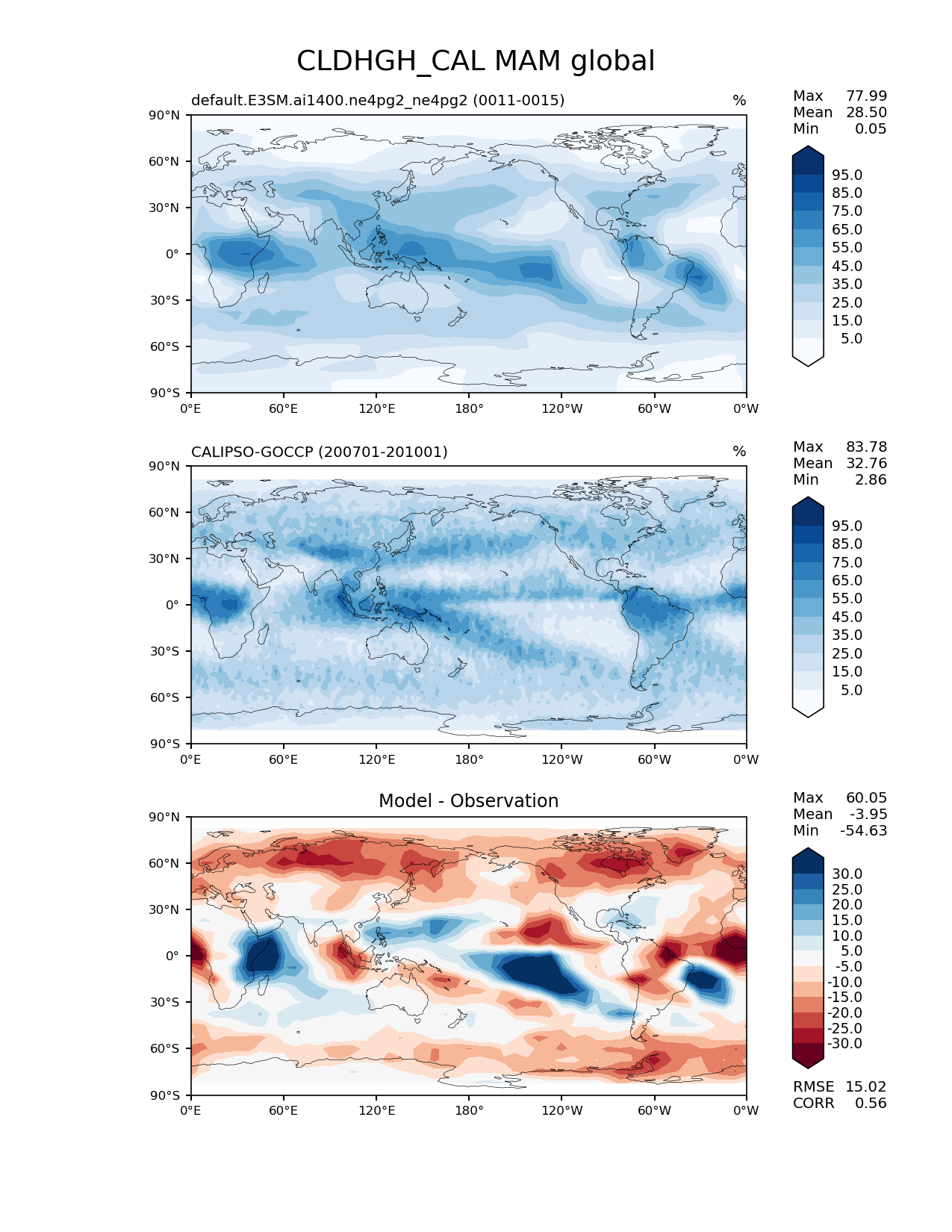 Use this command to recreate this image: | e3sm_diags lat_lon --no_viewer --case_id 'Cloud Calipso' --sets 'lat_lon' --run_type 'model_vs_obs' --variables 'CLDHGH_CAL' --seasons 'MAM' --regions 'global' --regrid_tool 'esmf' --regrid_method 'conservative' --main_title 'CLDHGH_CAL MAM global' --backend 'mpl' --output_format 'png' --canvas_size_w '1212' --canvas_size_h '1628' --figsize '8.5' '11.0' --dpi '150' --arrows --contour_levels '5' '15' '25' '35' '45' '55' '65' '75' '85' '95' --test_name 'default.E3SM.ai1400.ne4pg2_ne4pg2' --test_colormap 'Blues' --ref_name 'CALIPSOCOSP' --reference_name 'CALIPSO-GOCCP' --reference_colormap 'Blues' --diff_title 'Model - Observation' --diff_colormap 'RdBu' --diff_levels '-30' '-25' '-20' '-15' '-10' '-5' '5' '10' '15' '20' '25' '30' --multiprocessing --num_workers '32' --granulate 'variables' 'seasons' 'plevs' 'regions' --selectors 'sets' 'seasons' --reference_data_path '/global/cfs/cdirs/e3sm/acme_diags/obs_for_e3sm_diags/climatology/' --test_data_path '/global/cfs/cdirs/e3sm/emulate/postproc_e3sm/slice/default.E3SM.ai1400.ne4pg2_ne4pg2' --results_dir '/global/cfs/cdirs/e3sm/www/wagmanbe/slice/default.E3SM.ai1400.ne4pg2_ne4pg2' |