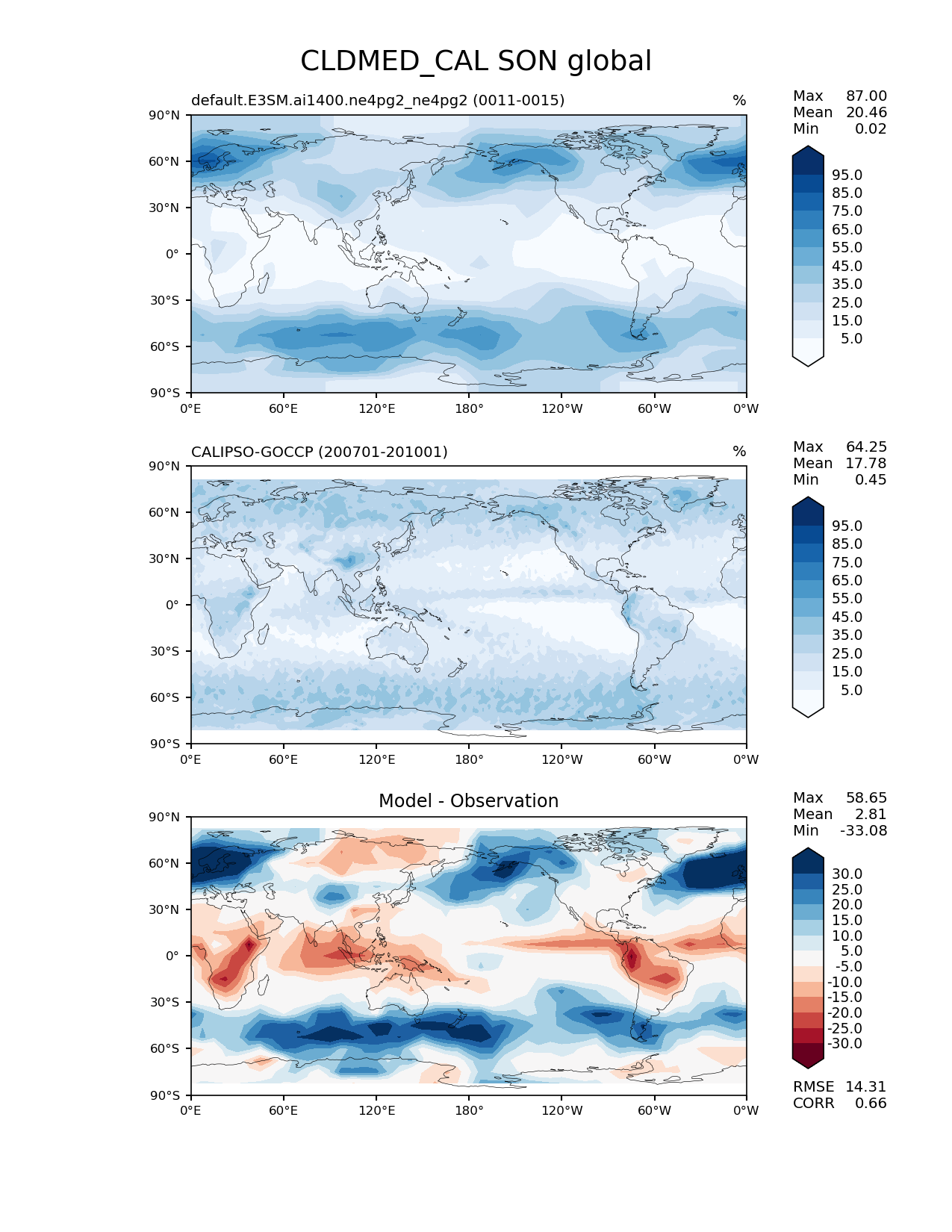 Use this command to recreate this image: | e3sm_diags lat_lon --no_viewer --case_id 'Cloud Calipso' --sets 'lat_lon' --run_type 'model_vs_obs' --variables 'CLDMED_CAL' --seasons 'SON' --regions 'global' --regrid_tool 'esmf' --regrid_method 'conservative' --main_title 'CLDMED_CAL SON global' --backend 'mpl' --output_format 'png' --canvas_size_w '1212' --canvas_size_h '1628' --figsize '8.5' '11.0' --dpi '150' --arrows --contour_levels '5' '15' '25' '35' '45' '55' '65' '75' '85' '95' --test_name 'default.E3SM.ai1400.ne4pg2_ne4pg2' --test_colormap 'Blues' --ref_name 'CALIPSOCOSP' --reference_name 'CALIPSO-GOCCP' --reference_colormap 'Blues' --diff_title 'Model - Observation' --diff_colormap 'RdBu' --diff_levels '-30' '-25' '-20' '-15' '-10' '-5' '5' '10' '15' '20' '25' '30' --multiprocessing --num_workers '32' --granulate 'variables' 'seasons' 'plevs' 'regions' --selectors 'sets' 'seasons' --reference_data_path '/global/cfs/cdirs/e3sm/acme_diags/obs_for_e3sm_diags/climatology/' --test_data_path '/global/cfs/cdirs/e3sm/emulate/postproc_e3sm/slice/default.E3SM.ai1400.ne4pg2_ne4pg2' --results_dir '/global/cfs/cdirs/e3sm/www/wagmanbe/slice/default.E3SM.ai1400.ne4pg2_ne4pg2' |