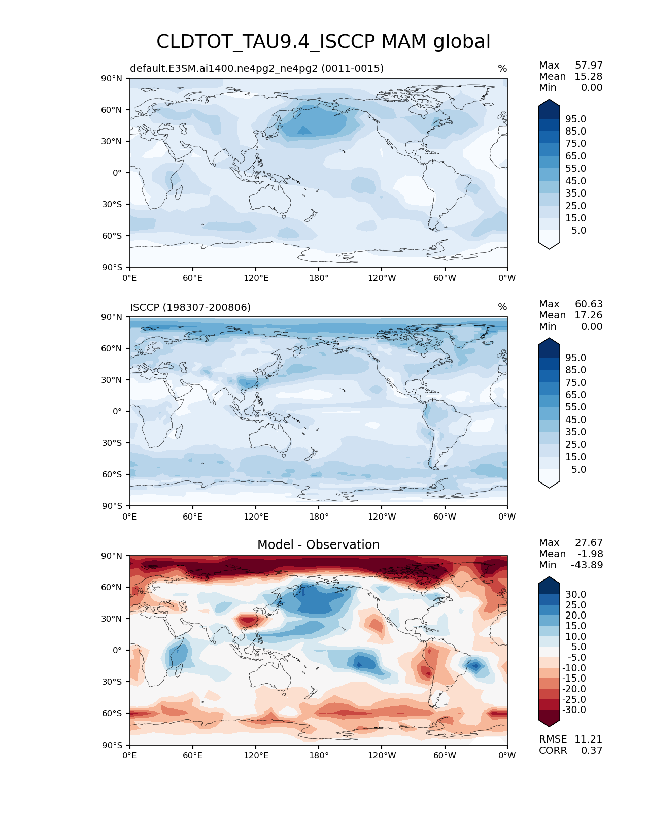 Use this command to recreate this image: | e3sm_diags lat_lon --no_viewer --case_id 'Cloud ISCCP' --sets 'lat_lon' --run_type 'model_vs_obs' --variables 'CLDTOT_TAU9.4_ISCCP' --seasons 'MAM' --regions 'global' --regrid_tool 'esmf' --regrid_method 'conservative' --main_title 'CLDTOT_TAU9.4_ISCCP MAM global' --backend 'mpl' --output_format 'png' --canvas_size_w '1212' --canvas_size_h '1628' --figsize '8.5' '11.0' --dpi '150' --arrows --contour_levels '5' '15' '25' '35' '45' '55' '65' '75' '85' '95' --test_name 'default.E3SM.ai1400.ne4pg2_ne4pg2' --test_colormap 'Blues' --ref_name 'ISCCPCOSP' --reference_name 'ISCCP' --reference_colormap 'Blues' --diff_title 'Model - Observation' --diff_colormap 'RdBu' --diff_levels '-30' '-25' '-20' '-15' '-10' '-5' '5' '10' '15' '20' '25' '30' --multiprocessing --num_workers '32' --granulate 'variables' 'seasons' 'plevs' 'regions' --selectors 'sets' 'seasons' --reference_data_path '/global/cfs/cdirs/e3sm/acme_diags/obs_for_e3sm_diags/climatology/' --test_data_path '/global/cfs/cdirs/e3sm/emulate/postproc_e3sm/slice/default.E3SM.ai1400.ne4pg2_ne4pg2' --results_dir '/global/cfs/cdirs/e3sm/www/wagmanbe/slice/default.E3SM.ai1400.ne4pg2_ne4pg2' |