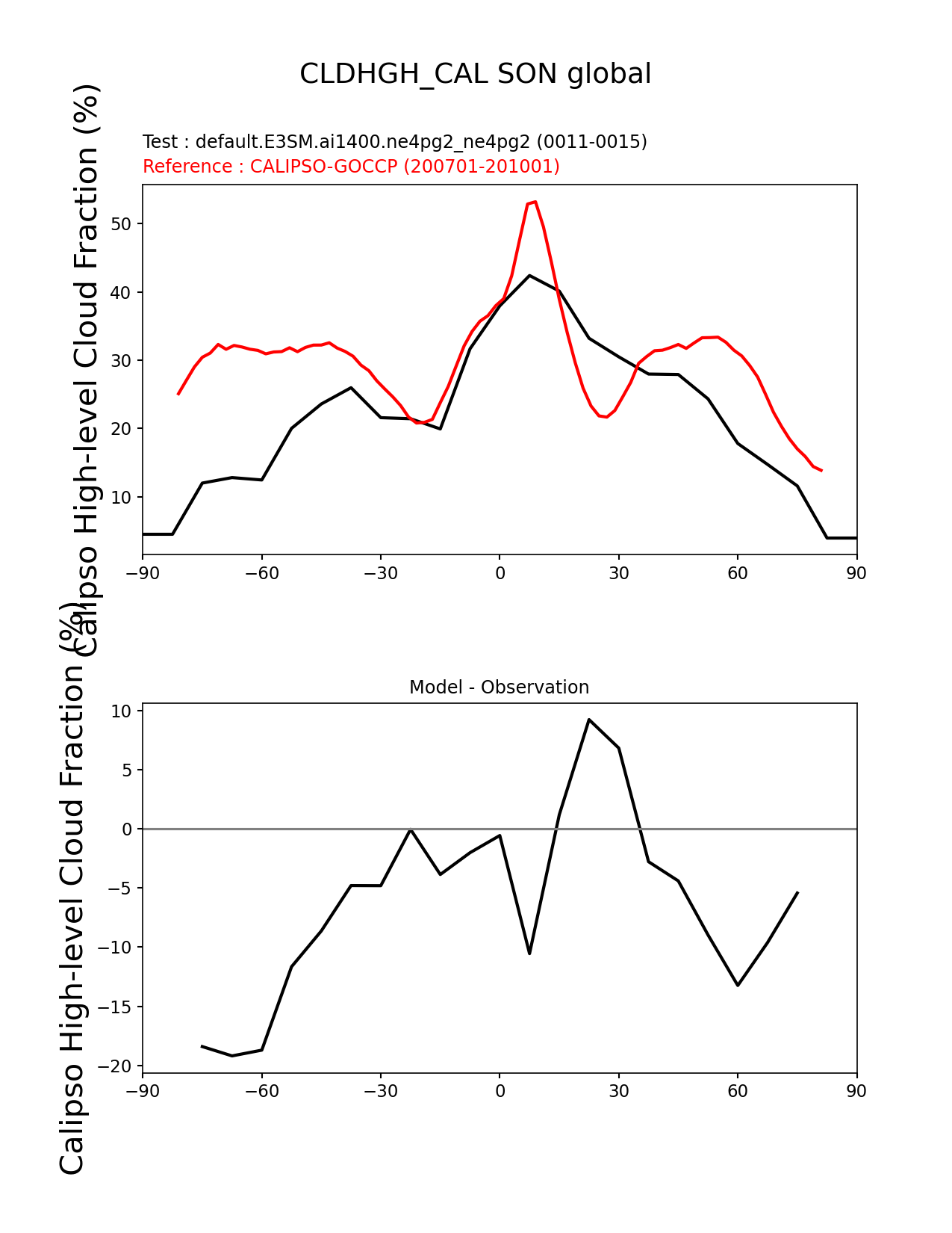Use this command to recreate this image: | e3sm_diags zonal_mean_xy --no_viewer --case_id 'Cloud Calipso' --sets 'zonal_mean_xy' --run_type 'model_vs_obs' --variables 'CLDHGH_CAL' --seasons 'SON' --regions 'global' --regrid_tool 'esmf' --regrid_method 'conservative' --main_title 'CLDHGH_CAL SON global' --backend 'mpl' --output_format 'png' --canvas_size_w '1212' --canvas_size_h '1628' --figsize '8.5' '11.0' --dpi '150' --arrows --test_name 'default.E3SM.ai1400.ne4pg2_ne4pg2' --test_colormap 'cet_rainbow.rgb' --ref_name 'CALIPSOCOSP' --reference_name 'CALIPSO-GOCCP' --reference_colormap 'cet_rainbow.rgb' --diff_title 'Model - Observation' --diff_colormap 'diverging_bwr.rgb' --multiprocessing --num_workers '32' --granulate 'variables' 'seasons' 'plevs' 'regions' --selectors 'sets' 'seasons' --reference_data_path '/global/cfs/cdirs/e3sm/acme_diags/obs_for_e3sm_diags/climatology/' --test_data_path '/global/cfs/cdirs/e3sm/emulate/postproc_e3sm/slice/default.E3SM.ai1400.ne4pg2_ne4pg2' --results_dir '/global/cfs/cdirs/e3sm/www/wagmanbe/slice/default.E3SM.ai1400.ne4pg2_ne4pg2' |