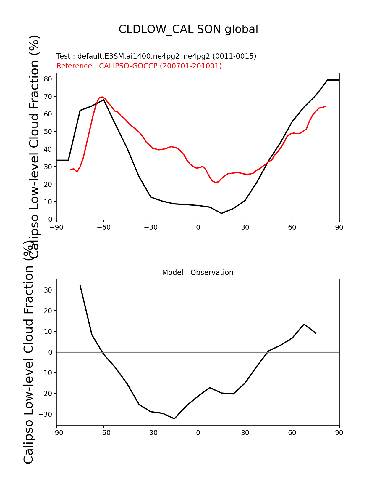 Use this command to recreate this image: | e3sm_diags zonal_mean_xy --no_viewer --case_id 'Cloud Calipso' --sets 'zonal_mean_xy' --run_type 'model_vs_obs' --variables 'CLDLOW_CAL' --seasons 'SON' --regions 'global' --regrid_tool 'esmf' --regrid_method 'conservative' --main_title 'CLDLOW_CAL SON global' --backend 'mpl' --output_format 'png' --canvas_size_w '1212' --canvas_size_h '1628' --figsize '8.5' '11.0' --dpi '150' --arrows --test_name 'default.E3SM.ai1400.ne4pg2_ne4pg2' --test_colormap 'cet_rainbow.rgb' --ref_name 'CALIPSOCOSP' --reference_name 'CALIPSO-GOCCP' --reference_colormap 'cet_rainbow.rgb' --diff_title 'Model - Observation' --diff_colormap 'diverging_bwr.rgb' --multiprocessing --num_workers '32' --granulate 'variables' 'seasons' 'plevs' 'regions' --selectors 'sets' 'seasons' --reference_data_path '/global/cfs/cdirs/e3sm/acme_diags/obs_for_e3sm_diags/climatology/' --test_data_path '/global/cfs/cdirs/e3sm/emulate/postproc_e3sm/slice/default.E3SM.ai1400.ne4pg2_ne4pg2' --results_dir '/global/cfs/cdirs/e3sm/www/wagmanbe/slice/default.E3SM.ai1400.ne4pg2_ne4pg2' |