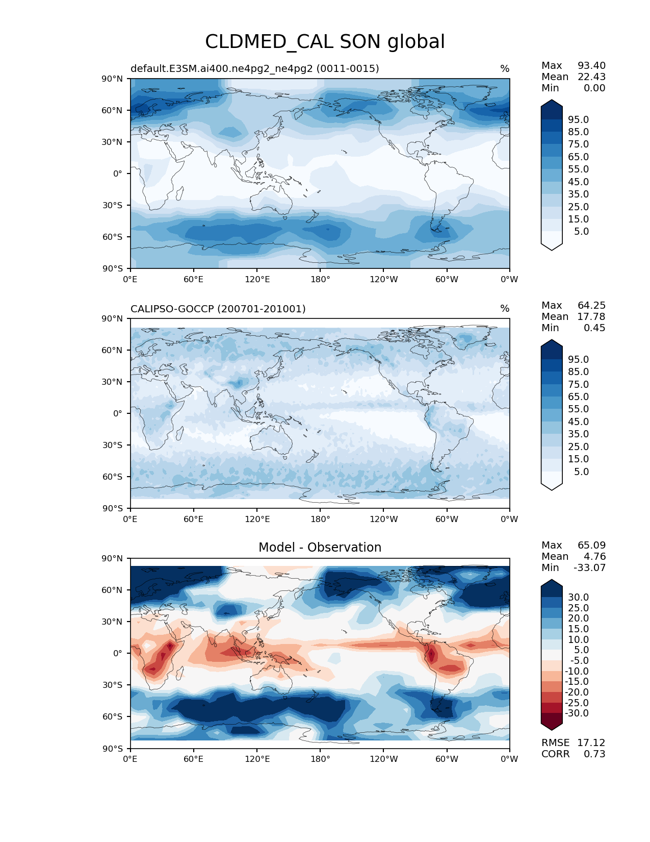Use this command to recreate this image: | e3sm_diags lat_lon --no_viewer --case_id 'Cloud Calipso' --sets 'lat_lon' --run_type 'model_vs_obs' --variables 'CLDMED_CAL' --seasons 'SON' --regions 'global' --regrid_tool 'esmf' --regrid_method 'conservative' --main_title 'CLDMED_CAL SON global' --backend 'mpl' --output_format 'png' --canvas_size_w '1212' --canvas_size_h '1628' --figsize '8.5' '11.0' --dpi '150' --arrows --contour_levels '5' '15' '25' '35' '45' '55' '65' '75' '85' '95' --test_name 'default.E3SM.ai400.ne4pg2_ne4pg2' --test_colormap 'Blues' --ref_name 'CALIPSOCOSP' --reference_name 'CALIPSO-GOCCP' --reference_colormap 'Blues' --diff_title 'Model - Observation' --diff_colormap 'RdBu' --diff_levels '-30' '-25' '-20' '-15' '-10' '-5' '5' '10' '15' '20' '25' '30' --multiprocessing --num_workers '32' --granulate 'variables' 'seasons' 'plevs' 'regions' --selectors 'sets' 'seasons' --reference_data_path '/global/cfs/cdirs/e3sm/acme_diags/obs_for_e3sm_diags/climatology/' --test_data_path '/global/cfs/cdirs/e3sm/emulate/postproc_e3sm/slice/default.E3SM.ai400.ne4pg2_ne4pg2' --results_dir '/global/cfs/cdirs/e3sm/www/wagmanbe/slice/default.E3SM.ai400.ne4pg2_ne4pg2' |
