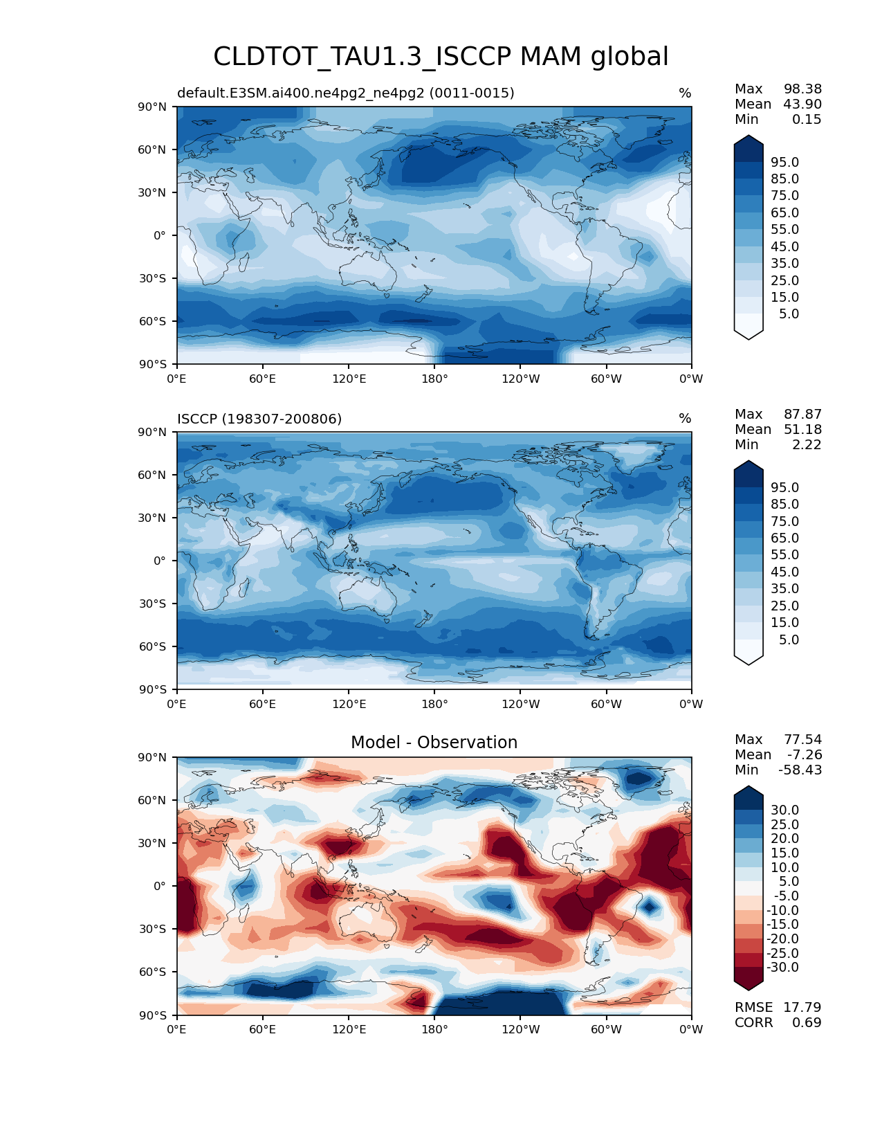 Use this command to recreate this image: | e3sm_diags lat_lon --no_viewer --case_id 'Cloud ISCCP' --sets 'lat_lon' --run_type 'model_vs_obs' --variables 'CLDTOT_TAU1.3_ISCCP' --seasons 'MAM' --regions 'global' --regrid_tool 'esmf' --regrid_method 'conservative' --main_title 'CLDTOT_TAU1.3_ISCCP MAM global' --backend 'mpl' --output_format 'png' --canvas_size_w '1212' --canvas_size_h '1628' --figsize '8.5' '11.0' --dpi '150' --arrows --contour_levels '5' '15' '25' '35' '45' '55' '65' '75' '85' '95' --test_name 'default.E3SM.ai400.ne4pg2_ne4pg2' --test_colormap 'Blues' --ref_name 'ISCCPCOSP' --reference_name 'ISCCP' --reference_colormap 'Blues' --diff_title 'Model - Observation' --diff_colormap 'RdBu' --diff_levels '-30' '-25' '-20' '-15' '-10' '-5' '5' '10' '15' '20' '25' '30' --multiprocessing --num_workers '32' --granulate 'variables' 'seasons' 'plevs' 'regions' --selectors 'sets' 'seasons' --reference_data_path '/global/cfs/cdirs/e3sm/acme_diags/obs_for_e3sm_diags/climatology/' --test_data_path '/global/cfs/cdirs/e3sm/emulate/postproc_e3sm/slice/default.E3SM.ai400.ne4pg2_ne4pg2' --results_dir '/global/cfs/cdirs/e3sm/www/wagmanbe/slice/default.E3SM.ai400.ne4pg2_ne4pg2' |