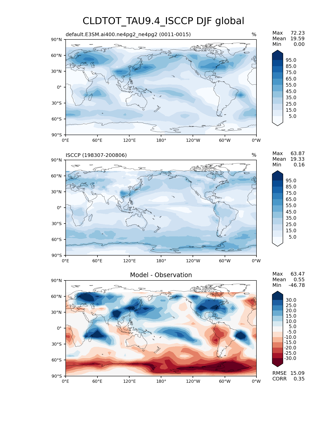 Use this command to recreate this image: | e3sm_diags lat_lon --no_viewer --case_id 'Cloud ISCCP' --sets 'lat_lon' --run_type 'model_vs_obs' --variables 'CLDTOT_TAU9.4_ISCCP' --seasons 'DJF' --regions 'global' --regrid_tool 'esmf' --regrid_method 'conservative' --main_title 'CLDTOT_TAU9.4_ISCCP DJF global' --backend 'mpl' --output_format 'png' --canvas_size_w '1212' --canvas_size_h '1628' --figsize '8.5' '11.0' --dpi '150' --arrows --contour_levels '5' '15' '25' '35' '45' '55' '65' '75' '85' '95' --test_name 'default.E3SM.ai400.ne4pg2_ne4pg2' --test_colormap 'Blues' --ref_name 'ISCCPCOSP' --reference_name 'ISCCP' --reference_colormap 'Blues' --diff_title 'Model - Observation' --diff_colormap 'RdBu' --diff_levels '-30' '-25' '-20' '-15' '-10' '-5' '5' '10' '15' '20' '25' '30' --multiprocessing --num_workers '32' --granulate 'variables' 'seasons' 'plevs' 'regions' --selectors 'sets' 'seasons' --reference_data_path '/global/cfs/cdirs/e3sm/acme_diags/obs_for_e3sm_diags/climatology/' --test_data_path '/global/cfs/cdirs/e3sm/emulate/postproc_e3sm/slice/default.E3SM.ai400.ne4pg2_ne4pg2' --results_dir '/global/cfs/cdirs/e3sm/www/wagmanbe/slice/default.E3SM.ai400.ne4pg2_ne4pg2' |