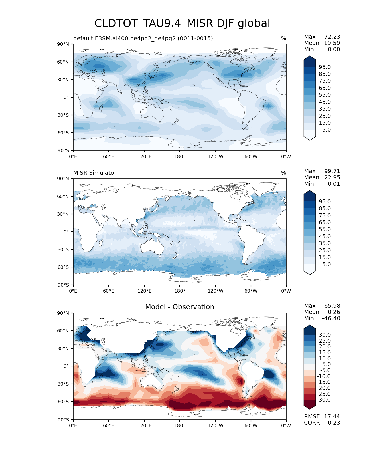 Use this command to recreate this image: | e3sm_diags lat_lon --no_viewer --case_id 'Cloud MISR' --sets 'lat_lon' --run_type 'model_vs_obs' --variables 'CLDTOT_TAU9.4_MISR' --seasons 'DJF' --regions 'global' --regrid_tool 'esmf' --regrid_method 'conservative' --main_title 'CLDTOT_TAU9.4_MISR DJF global' --backend 'mpl' --output_format 'png' --canvas_size_w '1212' --canvas_size_h '1628' --figsize '8.5' '11.0' --dpi '150' --arrows --contour_levels '5' '15' '25' '35' '45' '55' '65' '75' '85' '95' --test_name 'default.E3SM.ai400.ne4pg2_ne4pg2' --test_colormap 'Blues' --ref_name 'MISRCOSP' --reference_name 'MISR Simulator' --reference_colormap 'Blues' --diff_title 'Model - Observation' --diff_colormap 'RdBu' --diff_levels '-30' '-25' '-20' '-15' '-10' '-5' '5' '10' '15' '20' '25' '30' --multiprocessing --num_workers '32' --granulate 'variables' 'seasons' 'plevs' 'regions' --selectors 'sets' 'seasons' --reference_data_path '/global/cfs/cdirs/e3sm/acme_diags/obs_for_e3sm_diags/climatology/' --test_data_path '/global/cfs/cdirs/e3sm/emulate/postproc_e3sm/slice/default.E3SM.ai400.ne4pg2_ne4pg2' --results_dir '/global/cfs/cdirs/e3sm/www/wagmanbe/slice/default.E3SM.ai400.ne4pg2_ne4pg2' |