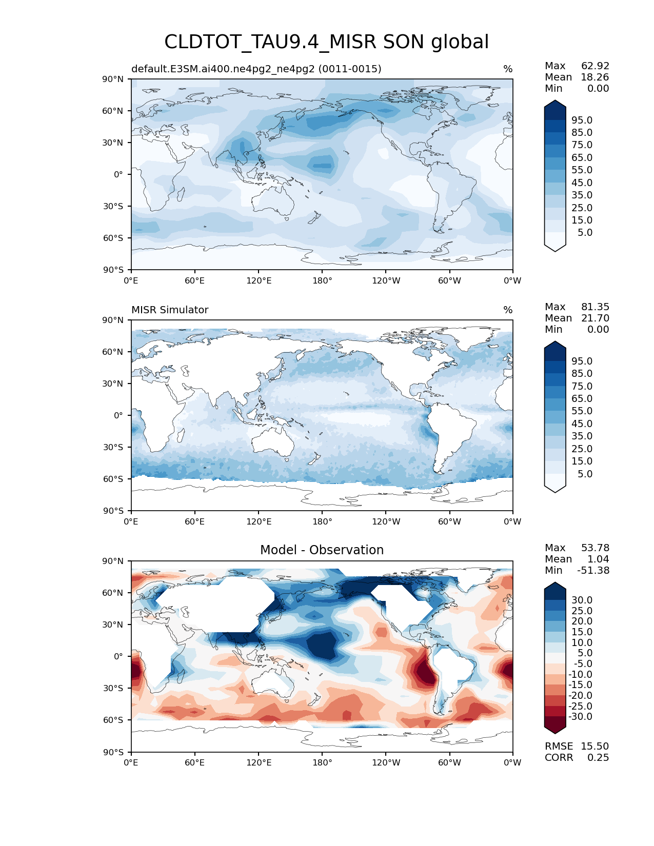 Use this command to recreate this image: | e3sm_diags lat_lon --no_viewer --case_id 'Cloud MISR' --sets 'lat_lon' --run_type 'model_vs_obs' --variables 'CLDTOT_TAU9.4_MISR' --seasons 'SON' --regions 'global' --regrid_tool 'esmf' --regrid_method 'conservative' --main_title 'CLDTOT_TAU9.4_MISR SON global' --backend 'mpl' --output_format 'png' --canvas_size_w '1212' --canvas_size_h '1628' --figsize '8.5' '11.0' --dpi '150' --arrows --contour_levels '5' '15' '25' '35' '45' '55' '65' '75' '85' '95' --test_name 'default.E3SM.ai400.ne4pg2_ne4pg2' --test_colormap 'Blues' --ref_name 'MISRCOSP' --reference_name 'MISR Simulator' --reference_colormap 'Blues' --diff_title 'Model - Observation' --diff_colormap 'RdBu' --diff_levels '-30' '-25' '-20' '-15' '-10' '-5' '5' '10' '15' '20' '25' '30' --multiprocessing --num_workers '32' --granulate 'variables' 'seasons' 'plevs' 'regions' --selectors 'sets' 'seasons' --reference_data_path '/global/cfs/cdirs/e3sm/acme_diags/obs_for_e3sm_diags/climatology/' --test_data_path '/global/cfs/cdirs/e3sm/emulate/postproc_e3sm/slice/default.E3SM.ai400.ne4pg2_ne4pg2' --results_dir '/global/cfs/cdirs/e3sm/www/wagmanbe/slice/default.E3SM.ai400.ne4pg2_ne4pg2' |