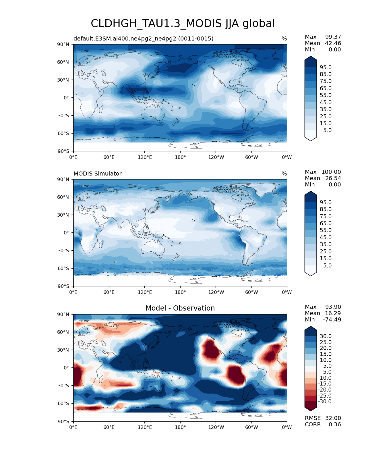 Use this command to recreate this image: | e3sm_diags lat_lon --no_viewer --case_id 'Cloud MODIS' --sets 'lat_lon' --run_type 'model_vs_obs' --variables 'CLDHGH_TAU1.3_MODIS' --seasons 'JJA' --regions 'global' --regrid_tool 'esmf' --regrid_method 'conservative' --main_title 'CLDHGH_TAU1.3_MODIS JJA global' --backend 'mpl' --output_format 'png' --canvas_size_w '1212' --canvas_size_h '1628' --figsize '8.5' '11.0' --dpi '150' --arrows --contour_levels '5' '15' '25' '35' '45' '55' '65' '75' '85' '95' --test_name 'default.E3SM.ai400.ne4pg2_ne4pg2' --test_colormap 'Blues' --ref_name 'MODISCOSP' --reference_name 'MODIS Simulator' --reference_colormap 'Blues' --diff_title 'Model - Observation' --diff_colormap 'RdBu' --diff_levels '-30' '-25' '-20' '-15' '-10' '-5' '5' '10' '15' '20' '25' '30' --multiprocessing --num_workers '32' --granulate 'variables' 'seasons' 'plevs' 'regions' --selectors 'sets' 'seasons' --reference_data_path '/global/cfs/cdirs/e3sm/acme_diags/obs_for_e3sm_diags/climatology/' --test_data_path '/global/cfs/cdirs/e3sm/emulate/postproc_e3sm/slice/default.E3SM.ai400.ne4pg2_ne4pg2' --results_dir '/global/cfs/cdirs/e3sm/www/wagmanbe/slice/default.E3SM.ai400.ne4pg2_ne4pg2' |