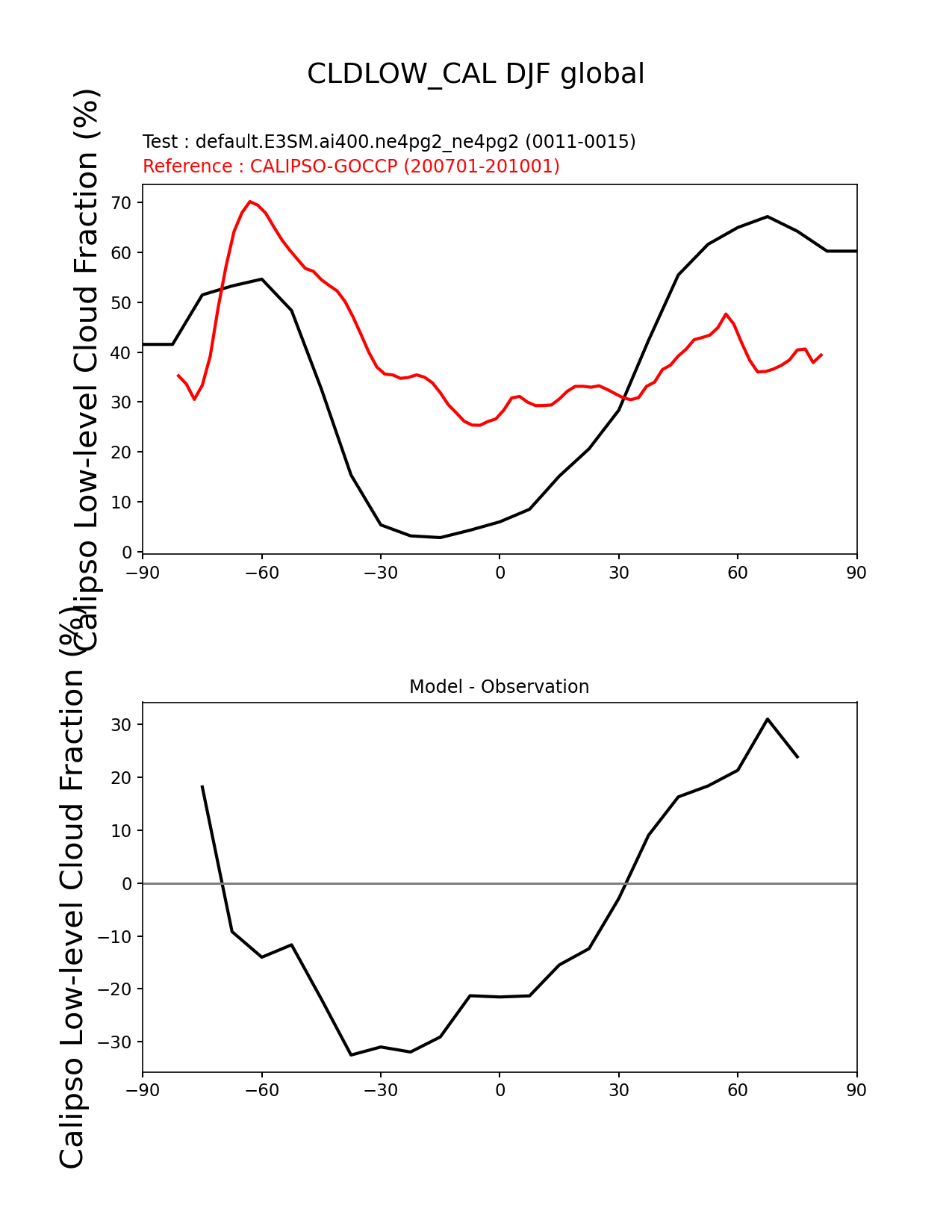 Use this command to recreate this image: | e3sm_diags zonal_mean_xy --no_viewer --case_id 'Cloud Calipso' --sets 'zonal_mean_xy' --run_type 'model_vs_obs' --variables 'CLDLOW_CAL' --seasons 'DJF' --regions 'global' --regrid_tool 'esmf' --regrid_method 'conservative' --main_title 'CLDLOW_CAL DJF global' --backend 'mpl' --output_format 'png' --canvas_size_w '1212' --canvas_size_h '1628' --figsize '8.5' '11.0' --dpi '150' --arrows --test_name 'default.E3SM.ai400.ne4pg2_ne4pg2' --test_colormap 'cet_rainbow.rgb' --ref_name 'CALIPSOCOSP' --reference_name 'CALIPSO-GOCCP' --reference_colormap 'cet_rainbow.rgb' --diff_title 'Model - Observation' --diff_colormap 'diverging_bwr.rgb' --multiprocessing --num_workers '32' --granulate 'variables' 'seasons' 'plevs' 'regions' --selectors 'sets' 'seasons' --reference_data_path '/global/cfs/cdirs/e3sm/acme_diags/obs_for_e3sm_diags/climatology/' --test_data_path '/global/cfs/cdirs/e3sm/emulate/postproc_e3sm/slice/default.E3SM.ai400.ne4pg2_ne4pg2' --results_dir '/global/cfs/cdirs/e3sm/www/wagmanbe/slice/default.E3SM.ai400.ne4pg2_ne4pg2' |