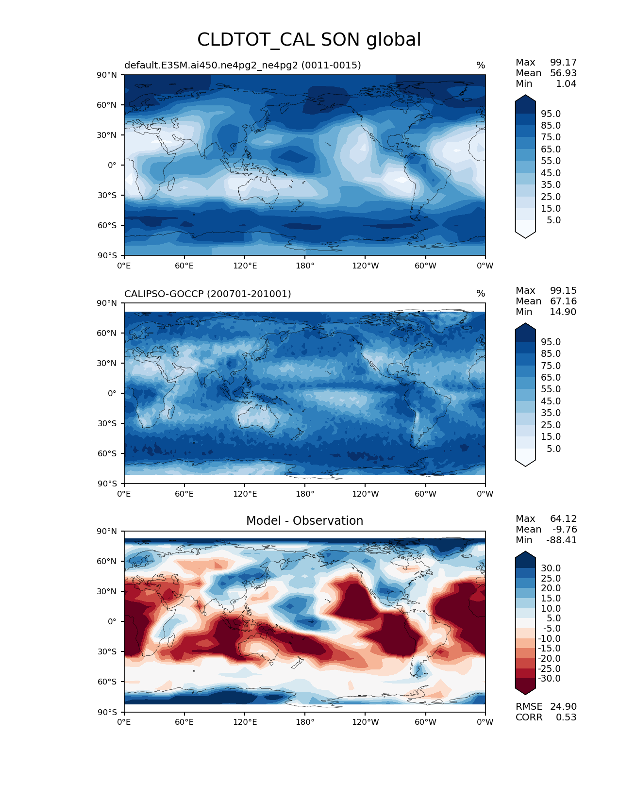 Use this command to recreate this image: | e3sm_diags lat_lon --no_viewer --case_id 'Cloud Calipso' --sets 'lat_lon' --run_type 'model_vs_obs' --variables 'CLDTOT_CAL' --seasons 'SON' --regions 'global' --regrid_tool 'esmf' --regrid_method 'conservative' --main_title 'CLDTOT_CAL SON global' --backend 'mpl' --output_format 'png' --canvas_size_w '1212' --canvas_size_h '1628' --figsize '8.5' '11.0' --dpi '150' --arrows --contour_levels '5' '15' '25' '35' '45' '55' '65' '75' '85' '95' --test_name 'default.E3SM.ai450.ne4pg2_ne4pg2' --test_colormap 'Blues' --ref_name 'CALIPSOCOSP' --reference_name 'CALIPSO-GOCCP' --reference_colormap 'Blues' --diff_title 'Model - Observation' --diff_colormap 'RdBu' --diff_levels '-30' '-25' '-20' '-15' '-10' '-5' '5' '10' '15' '20' '25' '30' --multiprocessing --num_workers '32' --granulate 'variables' 'seasons' 'plevs' 'regions' --selectors 'sets' 'seasons' --reference_data_path '/global/cfs/cdirs/e3sm/acme_diags/obs_for_e3sm_diags/climatology/' --test_data_path '/global/cfs/cdirs/e3sm/emulate/postproc_e3sm/slice/default.E3SM.ai450.ne4pg2_ne4pg2' --results_dir '/global/cfs/cdirs/e3sm/www/wagmanbe/slice/default.E3SM.ai450.ne4pg2_ne4pg2' |