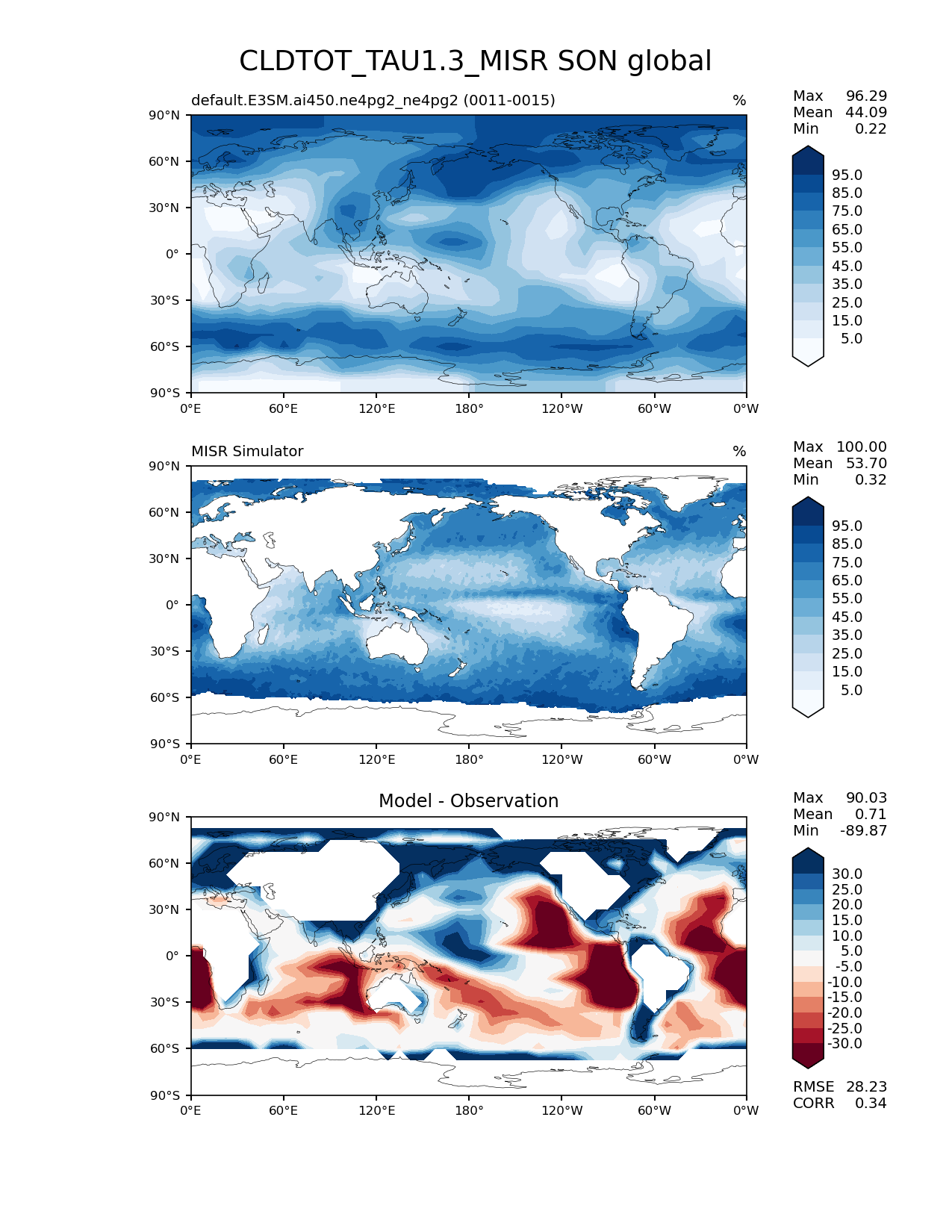 Use this command to recreate this image: | e3sm_diags lat_lon --no_viewer --case_id 'Cloud MISR' --sets 'lat_lon' --run_type 'model_vs_obs' --variables 'CLDTOT_TAU1.3_MISR' --seasons 'SON' --regions 'global' --regrid_tool 'esmf' --regrid_method 'conservative' --main_title 'CLDTOT_TAU1.3_MISR SON global' --backend 'mpl' --output_format 'png' --canvas_size_w '1212' --canvas_size_h '1628' --figsize '8.5' '11.0' --dpi '150' --arrows --contour_levels '5' '15' '25' '35' '45' '55' '65' '75' '85' '95' --test_name 'default.E3SM.ai450.ne4pg2_ne4pg2' --test_colormap 'Blues' --ref_name 'MISRCOSP' --reference_name 'MISR Simulator' --reference_colormap 'Blues' --diff_title 'Model - Observation' --diff_colormap 'RdBu' --diff_levels '-30' '-25' '-20' '-15' '-10' '-5' '5' '10' '15' '20' '25' '30' --multiprocessing --num_workers '32' --granulate 'variables' 'seasons' 'plevs' 'regions' --selectors 'sets' 'seasons' --reference_data_path '/global/cfs/cdirs/e3sm/acme_diags/obs_for_e3sm_diags/climatology/' --test_data_path '/global/cfs/cdirs/e3sm/emulate/postproc_e3sm/slice/default.E3SM.ai450.ne4pg2_ne4pg2' --results_dir '/global/cfs/cdirs/e3sm/www/wagmanbe/slice/default.E3SM.ai450.ne4pg2_ne4pg2' |