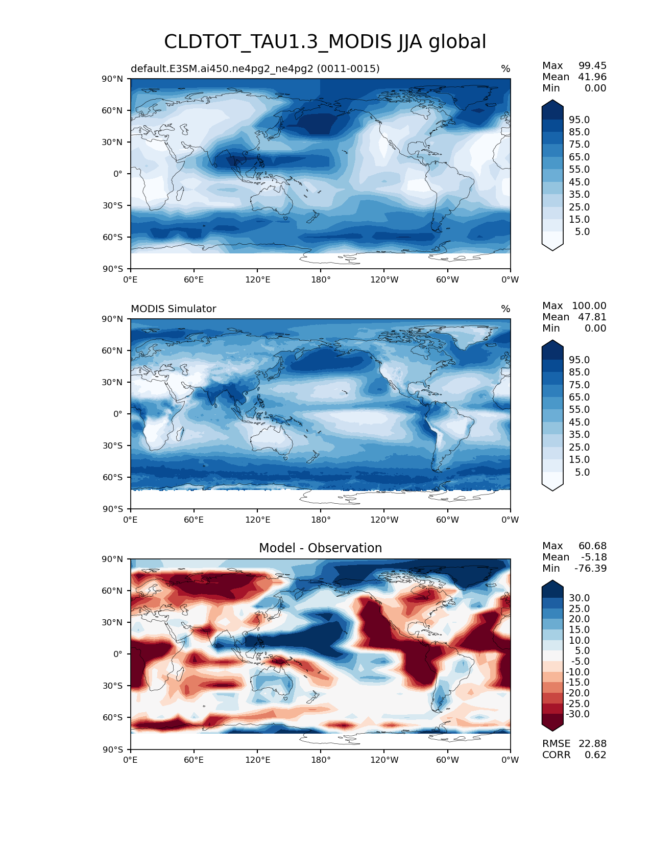 Use this command to recreate this image: | e3sm_diags lat_lon --no_viewer --case_id 'Cloud MODIS' --sets 'lat_lon' --run_type 'model_vs_obs' --variables 'CLDTOT_TAU1.3_MODIS' --seasons 'JJA' --regions 'global' --regrid_tool 'esmf' --regrid_method 'conservative' --main_title 'CLDTOT_TAU1.3_MODIS JJA global' --backend 'mpl' --output_format 'png' --canvas_size_w '1212' --canvas_size_h '1628' --figsize '8.5' '11.0' --dpi '150' --arrows --contour_levels '5' '15' '25' '35' '45' '55' '65' '75' '85' '95' --test_name 'default.E3SM.ai450.ne4pg2_ne4pg2' --test_colormap 'Blues' --ref_name 'MODISCOSP' --reference_name 'MODIS Simulator' --reference_colormap 'Blues' --diff_title 'Model - Observation' --diff_colormap 'RdBu' --diff_levels '-30' '-25' '-20' '-15' '-10' '-5' '5' '10' '15' '20' '25' '30' --multiprocessing --num_workers '32' --granulate 'variables' 'seasons' 'plevs' 'regions' --selectors 'sets' 'seasons' --reference_data_path '/global/cfs/cdirs/e3sm/acme_diags/obs_for_e3sm_diags/climatology/' --test_data_path '/global/cfs/cdirs/e3sm/emulate/postproc_e3sm/slice/default.E3SM.ai450.ne4pg2_ne4pg2' --results_dir '/global/cfs/cdirs/e3sm/www/wagmanbe/slice/default.E3SM.ai450.ne4pg2_ne4pg2' |