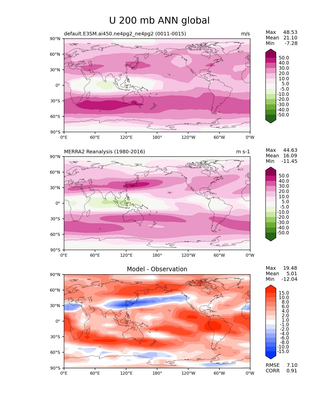 Use this command to recreate this image: | e3sm_diags lat_lon --no_viewer --case_id 'MERRA2' --sets 'lat_lon' --run_type 'model_vs_obs' --variables 'U' --seasons 'ANN' --regions 'global' --regrid_tool 'esmf' --regrid_method 'conservative' --plevs '200.0' --main_title 'U 200 mb ANN global' --backend 'mpl' --output_format 'png' --canvas_size_w '1212' --canvas_size_h '1628' --figsize '8.5' '11.0' --dpi '150' --arrows --contour_levels '-50' '-40' '-30' '-20' '-10' '-5' '5' '10' '20' '30' '40' '50' --test_name 'default.E3SM.ai450.ne4pg2_ne4pg2' --test_colormap 'PiYG_r' --ref_name 'MERRA2' --reference_name 'MERRA2 Reanalysis' --reference_colormap 'PiYG_r' --diff_title 'Model - Observation' --diff_colormap 'diverging_bwr.rgb' --diff_levels '-15' '-10' '-8' '-6' '-4' '-2' '-1' '1' '2' '4' '6' '8' '10' '15' --multiprocessing --num_workers '32' --granulate 'variables' 'seasons' 'plevs' 'regions' --selectors 'sets' 'seasons' --reference_data_path '/global/cfs/cdirs/e3sm/acme_diags/obs_for_e3sm_diags/climatology/' --test_data_path '/global/cfs/cdirs/e3sm/emulate/postproc_e3sm/slice/default.E3SM.ai450.ne4pg2_ne4pg2' --results_dir '/global/cfs/cdirs/e3sm/www/wagmanbe/slice/default.E3SM.ai450.ne4pg2_ne4pg2' |