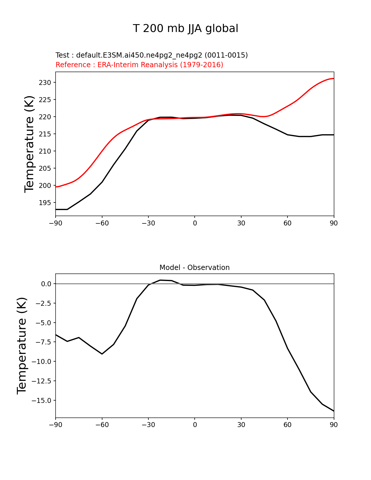 Use this command to recreate this image: | e3sm_diags zonal_mean_xy --no_viewer --case_id 'ERA-Interim' --sets 'zonal_mean_xy' --run_type 'model_vs_obs' --variables 'T' --seasons 'JJA' --regions 'global' --regrid_tool 'esmf' --regrid_method 'conservative' --plevs '200.0' --main_title 'T 200 mb JJA global' --backend 'mpl' --output_format 'png' --canvas_size_w '1212' --canvas_size_h '1628' --figsize '8.5' '11.0' --dpi '150' --arrows --test_name 'default.E3SM.ai450.ne4pg2_ne4pg2' --test_colormap 'cet_rainbow.rgb' --ref_name 'ERA-Interim' --reference_name 'ERA-Interim Reanalysis' --reference_colormap 'cet_rainbow.rgb' --diff_title 'Model - Observation' --diff_colormap 'diverging_bwr.rgb' --multiprocessing --num_workers '32' --granulate 'variables' 'seasons' 'plevs' 'regions' --selectors 'sets' 'seasons' --reference_data_path '/global/cfs/cdirs/e3sm/acme_diags/obs_for_e3sm_diags/climatology/' --test_data_path '/global/cfs/cdirs/e3sm/emulate/postproc_e3sm/slice/default.E3SM.ai450.ne4pg2_ne4pg2' --results_dir '/global/cfs/cdirs/e3sm/www/wagmanbe/slice/default.E3SM.ai450.ne4pg2_ne4pg2' |