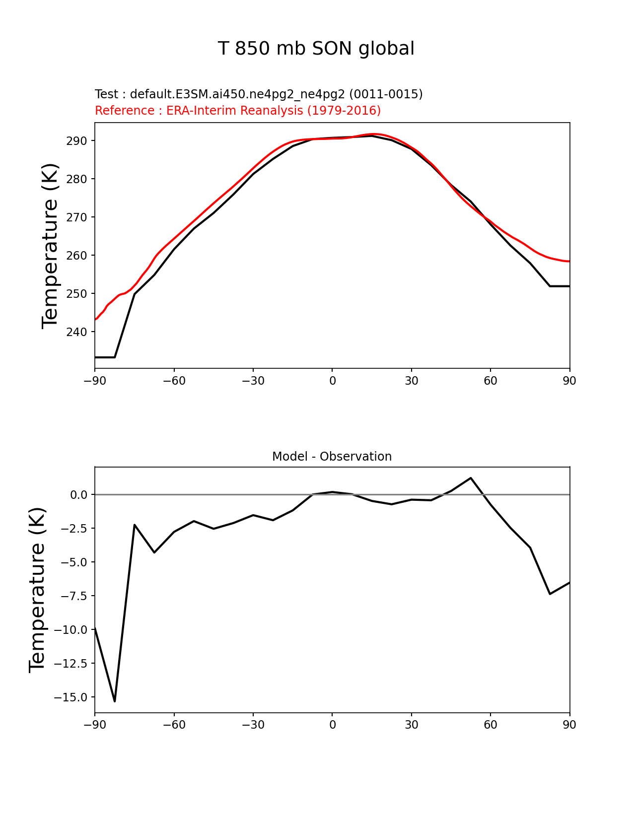 Use this command to recreate this image: | e3sm_diags zonal_mean_xy --no_viewer --case_id 'ERA-Interim' --sets 'zonal_mean_xy' --run_type 'model_vs_obs' --variables 'T' --seasons 'SON' --regions 'global' --regrid_tool 'esmf' --regrid_method 'conservative' --plevs '850.0' --main_title 'T 850 mb SON global' --backend 'mpl' --output_format 'png' --canvas_size_w '1212' --canvas_size_h '1628' --figsize '8.5' '11.0' --dpi '150' --arrows --test_name 'default.E3SM.ai450.ne4pg2_ne4pg2' --test_colormap 'cet_rainbow.rgb' --ref_name 'ERA-Interim' --reference_name 'ERA-Interim Reanalysis' --reference_colormap 'cet_rainbow.rgb' --diff_title 'Model - Observation' --diff_colormap 'diverging_bwr.rgb' --multiprocessing --num_workers '32' --granulate 'variables' 'seasons' 'plevs' 'regions' --selectors 'sets' 'seasons' --reference_data_path '/global/cfs/cdirs/e3sm/acme_diags/obs_for_e3sm_diags/climatology/' --test_data_path '/global/cfs/cdirs/e3sm/emulate/postproc_e3sm/slice/default.E3SM.ai450.ne4pg2_ne4pg2' --results_dir '/global/cfs/cdirs/e3sm/www/wagmanbe/slice/default.E3SM.ai450.ne4pg2_ne4pg2' |