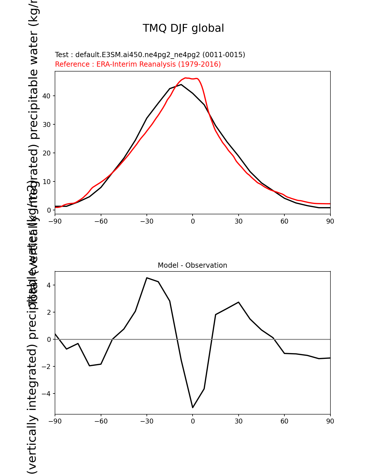 Use this command to recreate this image: | e3sm_diags zonal_mean_xy --no_viewer --case_id 'ERA-Interim' --sets 'zonal_mean_xy' --run_type 'model_vs_obs' --variables 'TMQ' --seasons 'DJF' --regions 'global' --regrid_tool 'esmf' --regrid_method 'conservative' --main_title 'TMQ DJF global' --backend 'mpl' --output_format 'png' --canvas_size_w '1212' --canvas_size_h '1628' --figsize '8.5' '11.0' --dpi '150' --arrows --test_name 'default.E3SM.ai450.ne4pg2_ne4pg2' --test_colormap 'cet_rainbow.rgb' --ref_name 'ERA-Interim' --reference_name 'ERA-Interim Reanalysis' --reference_colormap 'cet_rainbow.rgb' --diff_title 'Model - Observation' --diff_colormap 'diverging_bwr.rgb' --multiprocessing --num_workers '32' --granulate 'variables' 'seasons' 'plevs' 'regions' --selectors 'sets' 'seasons' --reference_data_path '/global/cfs/cdirs/e3sm/acme_diags/obs_for_e3sm_diags/climatology/' --test_data_path '/global/cfs/cdirs/e3sm/emulate/postproc_e3sm/slice/default.E3SM.ai450.ne4pg2_ne4pg2' --results_dir '/global/cfs/cdirs/e3sm/www/wagmanbe/slice/default.E3SM.ai450.ne4pg2_ne4pg2' |