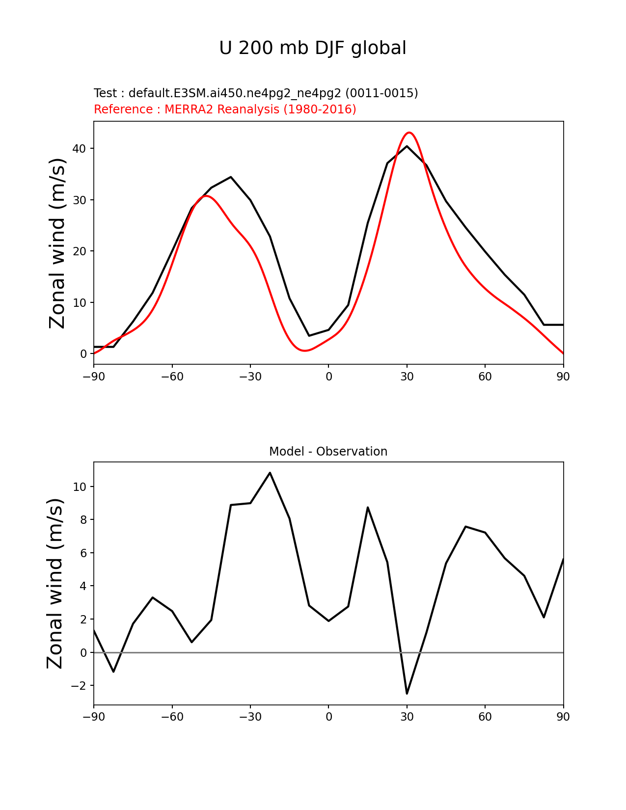 Use this command to recreate this image: | e3sm_diags zonal_mean_xy --no_viewer --case_id 'MERRA2' --sets 'zonal_mean_xy' --run_type 'model_vs_obs' --variables 'U' --seasons 'DJF' --regions 'global' --regrid_tool 'esmf' --regrid_method 'conservative' --plevs '200.0' --main_title 'U 200 mb DJF global' --backend 'mpl' --output_format 'png' --canvas_size_w '1212' --canvas_size_h '1628' --figsize '8.5' '11.0' --dpi '150' --arrows --test_name 'default.E3SM.ai450.ne4pg2_ne4pg2' --test_colormap 'cet_rainbow.rgb' --ref_name 'MERRA2' --reference_name 'MERRA2 Reanalysis' --reference_colormap 'cet_rainbow.rgb' --diff_title 'Model - Observation' --diff_colormap 'diverging_bwr.rgb' --multiprocessing --num_workers '32' --granulate 'variables' 'seasons' 'plevs' 'regions' --selectors 'sets' 'seasons' --reference_data_path '/global/cfs/cdirs/e3sm/acme_diags/obs_for_e3sm_diags/climatology/' --test_data_path '/global/cfs/cdirs/e3sm/emulate/postproc_e3sm/slice/default.E3SM.ai450.ne4pg2_ne4pg2' --results_dir '/global/cfs/cdirs/e3sm/www/wagmanbe/slice/default.E3SM.ai450.ne4pg2_ne4pg2' |