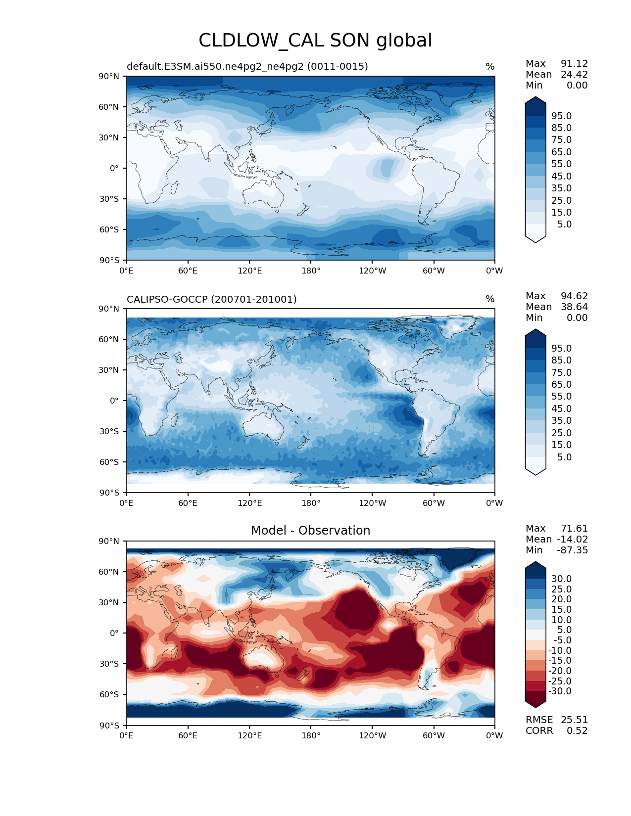 Use this command to recreate this image: | e3sm_diags lat_lon --no_viewer --case_id 'Cloud Calipso' --sets 'lat_lon' --run_type 'model_vs_obs' --variables 'CLDLOW_CAL' --seasons 'SON' --regions 'global' --regrid_tool 'esmf' --regrid_method 'conservative' --main_title 'CLDLOW_CAL SON global' --backend 'mpl' --output_format 'png' --canvas_size_w '1212' --canvas_size_h '1628' --figsize '8.5' '11.0' --dpi '150' --arrows --contour_levels '5' '15' '25' '35' '45' '55' '65' '75' '85' '95' --test_name 'default.E3SM.ai550.ne4pg2_ne4pg2' --test_colormap 'Blues' --ref_name 'CALIPSOCOSP' --reference_name 'CALIPSO-GOCCP' --reference_colormap 'Blues' --diff_title 'Model - Observation' --diff_colormap 'RdBu' --diff_levels '-30' '-25' '-20' '-15' '-10' '-5' '5' '10' '15' '20' '25' '30' --multiprocessing --num_workers '32' --granulate 'variables' 'seasons' 'plevs' 'regions' --selectors 'sets' 'seasons' --reference_data_path '/global/cfs/cdirs/e3sm/acme_diags/obs_for_e3sm_diags/climatology/' --test_data_path '/global/cfs/cdirs/e3sm/emulate/postproc_e3sm/slice/default.E3SM.ai550.ne4pg2_ne4pg2' --results_dir '/global/cfs/cdirs/e3sm/www/wagmanbe/slice/default.E3SM.ai550.ne4pg2_ne4pg2' |