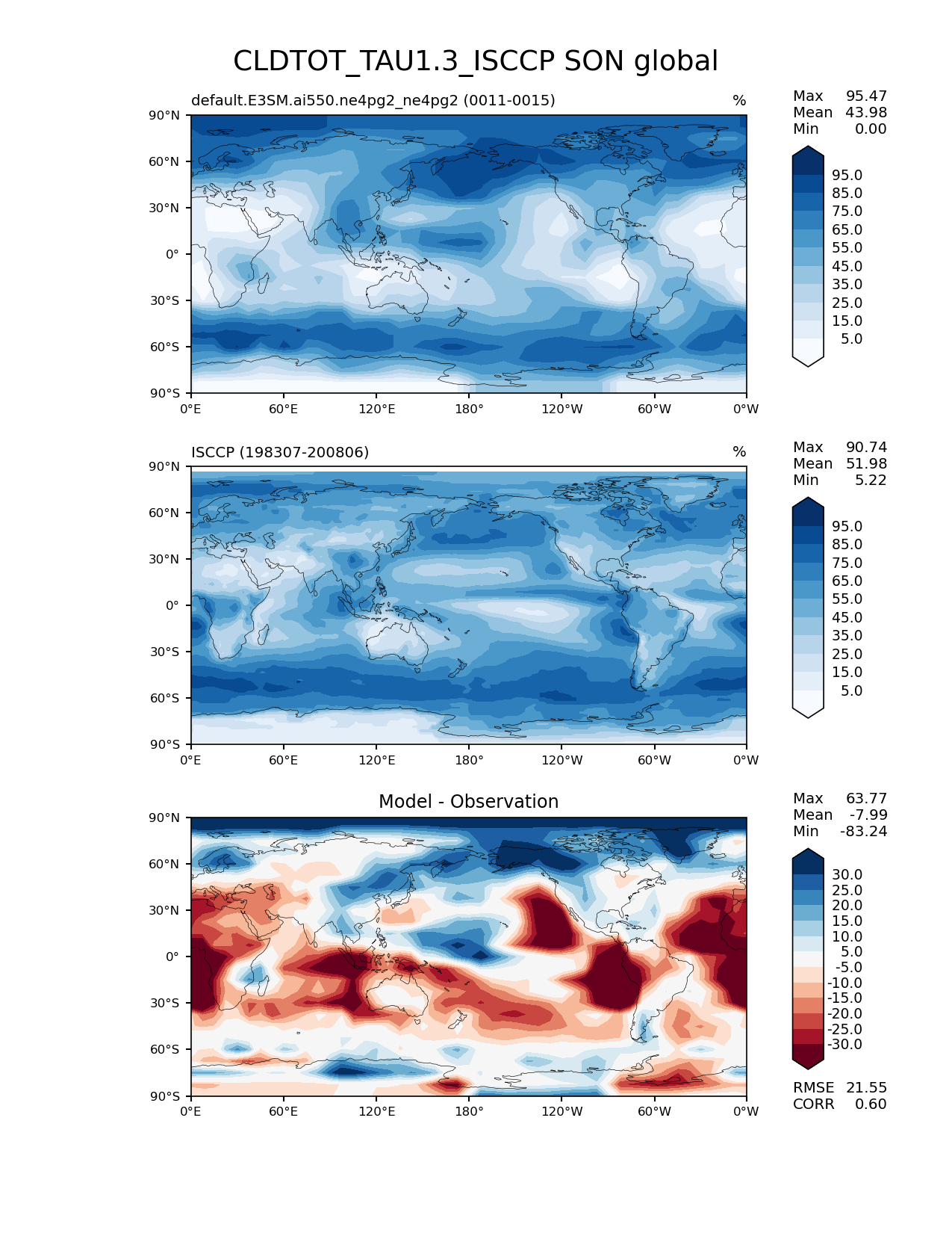 Use this command to recreate this image: | e3sm_diags lat_lon --no_viewer --case_id 'Cloud ISCCP' --sets 'lat_lon' --run_type 'model_vs_obs' --variables 'CLDTOT_TAU1.3_ISCCP' --seasons 'SON' --regions 'global' --regrid_tool 'esmf' --regrid_method 'conservative' --main_title 'CLDTOT_TAU1.3_ISCCP SON global' --backend 'mpl' --output_format 'png' --canvas_size_w '1212' --canvas_size_h '1628' --figsize '8.5' '11.0' --dpi '150' --arrows --contour_levels '5' '15' '25' '35' '45' '55' '65' '75' '85' '95' --test_name 'default.E3SM.ai550.ne4pg2_ne4pg2' --test_colormap 'Blues' --ref_name 'ISCCPCOSP' --reference_name 'ISCCP' --reference_colormap 'Blues' --diff_title 'Model - Observation' --diff_colormap 'RdBu' --diff_levels '-30' '-25' '-20' '-15' '-10' '-5' '5' '10' '15' '20' '25' '30' --multiprocessing --num_workers '32' --granulate 'variables' 'seasons' 'plevs' 'regions' --selectors 'sets' 'seasons' --reference_data_path '/global/cfs/cdirs/e3sm/acme_diags/obs_for_e3sm_diags/climatology/' --test_data_path '/global/cfs/cdirs/e3sm/emulate/postproc_e3sm/slice/default.E3SM.ai550.ne4pg2_ne4pg2' --results_dir '/global/cfs/cdirs/e3sm/www/wagmanbe/slice/default.E3SM.ai550.ne4pg2_ne4pg2' |