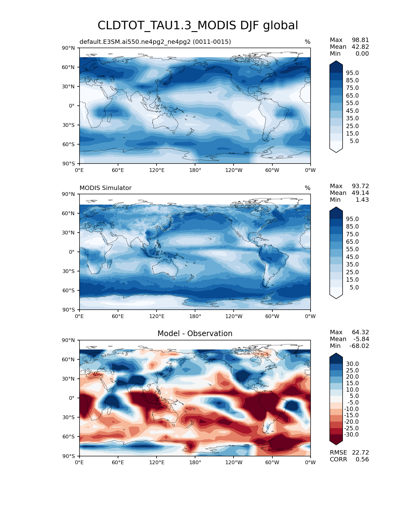 Use this command to recreate this image: | e3sm_diags lat_lon --no_viewer --case_id 'Cloud MODIS' --sets 'lat_lon' --run_type 'model_vs_obs' --variables 'CLDTOT_TAU1.3_MODIS' --seasons 'DJF' --regions 'global' --regrid_tool 'esmf' --regrid_method 'conservative' --main_title 'CLDTOT_TAU1.3_MODIS DJF global' --backend 'mpl' --output_format 'png' --canvas_size_w '1212' --canvas_size_h '1628' --figsize '8.5' '11.0' --dpi '150' --arrows --contour_levels '5' '15' '25' '35' '45' '55' '65' '75' '85' '95' --test_name 'default.E3SM.ai550.ne4pg2_ne4pg2' --test_colormap 'Blues' --ref_name 'MODISCOSP' --reference_name 'MODIS Simulator' --reference_colormap 'Blues' --diff_title 'Model - Observation' --diff_colormap 'RdBu' --diff_levels '-30' '-25' '-20' '-15' '-10' '-5' '5' '10' '15' '20' '25' '30' --multiprocessing --num_workers '32' --granulate 'variables' 'seasons' 'plevs' 'regions' --selectors 'sets' 'seasons' --reference_data_path '/global/cfs/cdirs/e3sm/acme_diags/obs_for_e3sm_diags/climatology/' --test_data_path '/global/cfs/cdirs/e3sm/emulate/postproc_e3sm/slice/default.E3SM.ai550.ne4pg2_ne4pg2' --results_dir '/global/cfs/cdirs/e3sm/www/wagmanbe/slice/default.E3SM.ai550.ne4pg2_ne4pg2' |