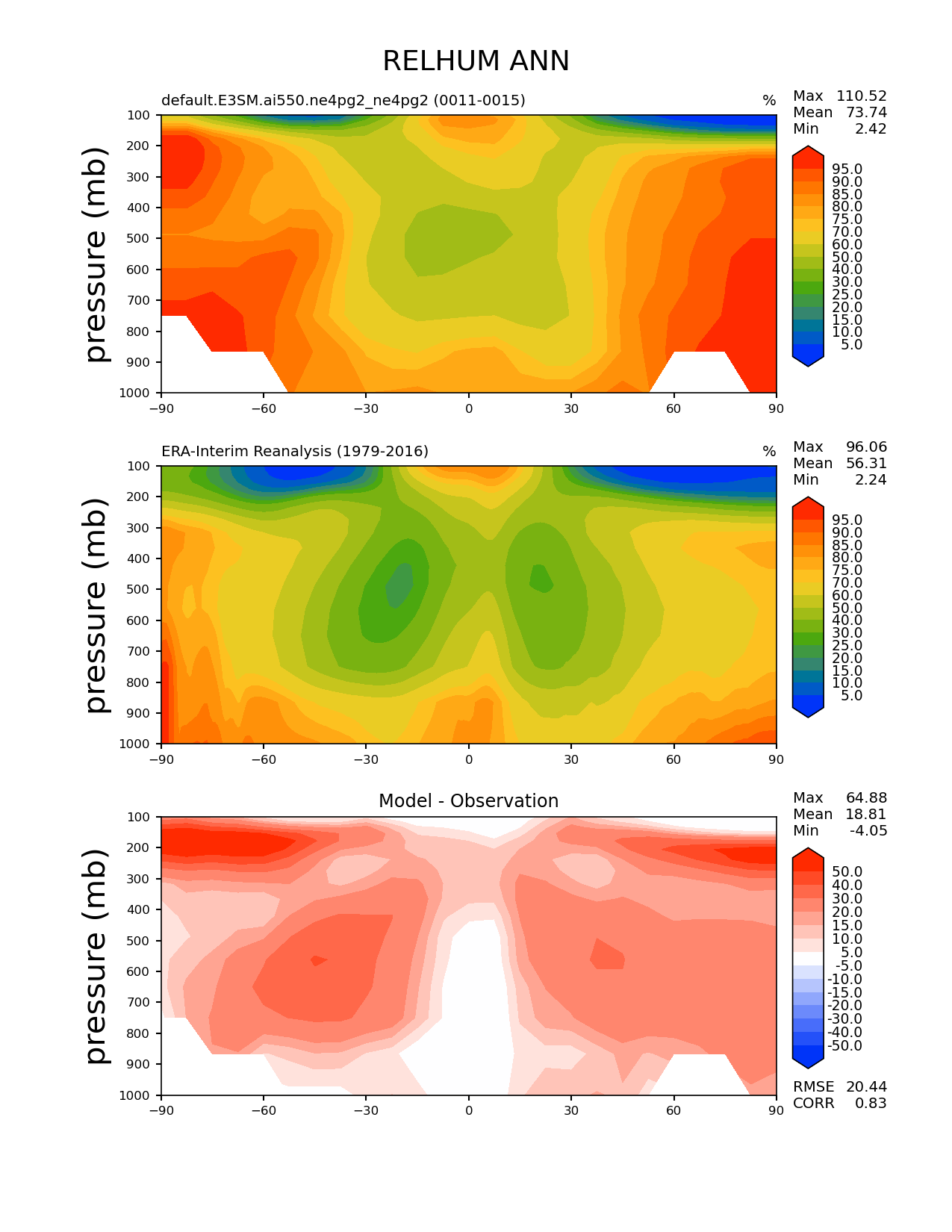 Use this command to recreate this image: | e3sm_diags zonal_mean_2d --no_viewer --case_id 'ERA-Interim' --sets 'zonal_mean_2d' --run_type 'model_vs_obs' --variables 'RELHUM' --seasons 'ANN' --regions 'global' --regrid_tool 'esmf' --regrid_method 'conservative' --plevs '100.0' '115.47819846894582' '133.3521432163324' '153.9926526059492' '177.82794100389228' '205.3525026457146' '237.13737056616552' '273.8419634264361' '316.22776601683796' '365.1741272548377' '421.6965034285823' '486.9675251658631' '562.341325190349' '649.3816315762114' '749.8942093324558' '865.9643233600654' '1000.0' --main_title 'RELHUM ANN' --backend 'mpl' --output_format 'png' --canvas_size_w '1212' --canvas_size_h '1628' --figsize '8.5' '11.0' --dpi '150' --arrows --contour_levels '5' '10' '15' '20' '25' '30' '40' '50' '60' '70' '75' '80' '85' '90' '95' --test_name 'default.E3SM.ai550.ne4pg2_ne4pg2' --test_colormap 'cet_rainbow.rgb' --ref_name 'ERA-Interim' --reference_name 'ERA-Interim Reanalysis' --reference_colormap 'cet_rainbow.rgb' --diff_title 'Model - Observation' --diff_colormap 'diverging_bwr.rgb' --diff_levels '-50' '-40' '-30' '-20' '-15' '-10' '-5' '5' '10' '15' '20' '30' '40' '50' --multiprocessing --num_workers '32' --granulate 'variables' 'seasons' 'regions' --selectors 'sets' 'seasons' --reference_data_path '/global/cfs/cdirs/e3sm/acme_diags/obs_for_e3sm_diags/climatology/' --test_data_path '/global/cfs/cdirs/e3sm/emulate/postproc_e3sm/slice/default.E3SM.ai550.ne4pg2_ne4pg2' --results_dir '/global/cfs/cdirs/e3sm/www/wagmanbe/slice/default.E3SM.ai550.ne4pg2_ne4pg2' |