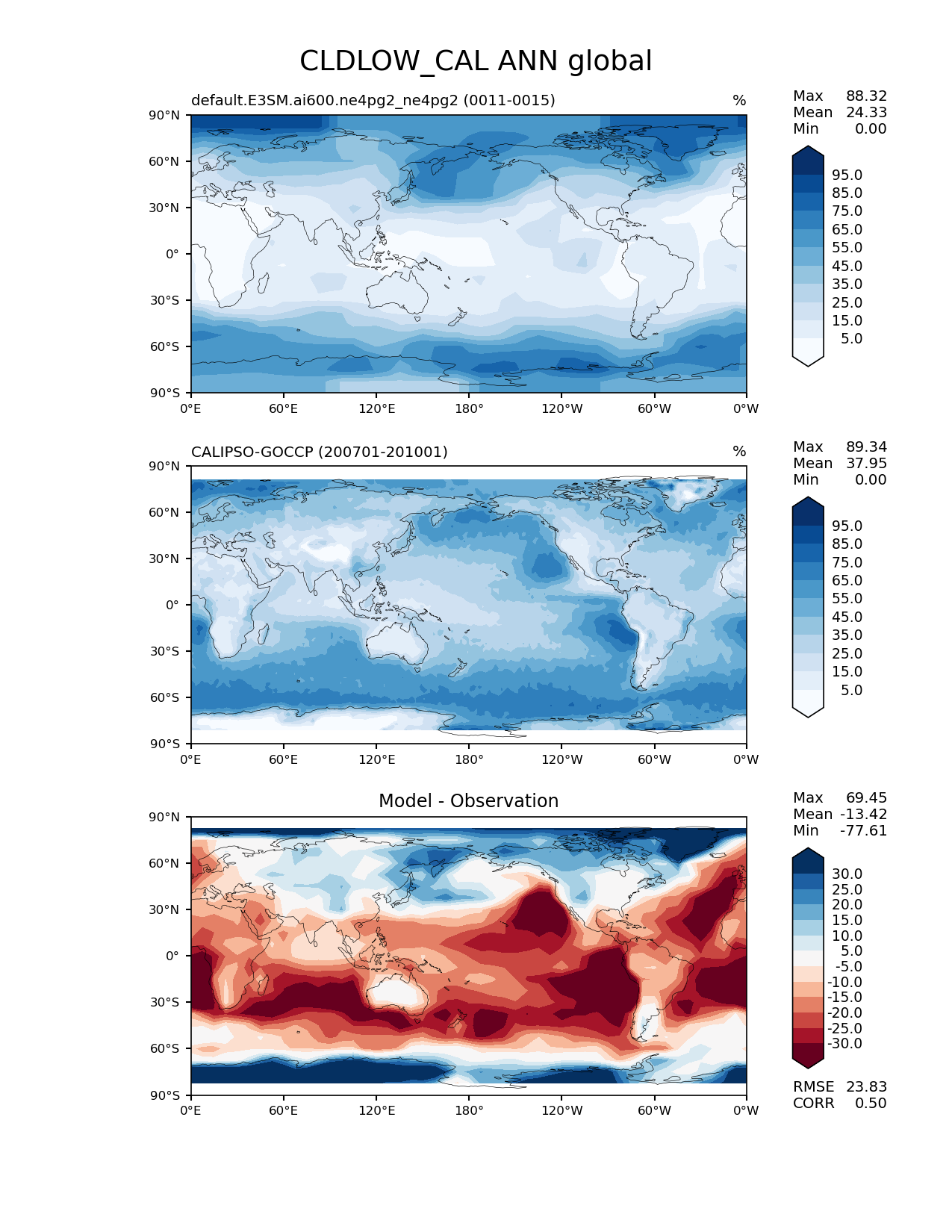 Use this command to recreate this image: | e3sm_diags lat_lon --no_viewer --case_id 'Cloud Calipso' --sets 'lat_lon' --run_type 'model_vs_obs' --variables 'CLDLOW_CAL' --seasons 'ANN' --regions 'global' --regrid_tool 'esmf' --regrid_method 'conservative' --main_title 'CLDLOW_CAL ANN global' --backend 'mpl' --output_format 'png' --canvas_size_w '1212' --canvas_size_h '1628' --figsize '8.5' '11.0' --dpi '150' --arrows --contour_levels '5' '15' '25' '35' '45' '55' '65' '75' '85' '95' --test_name 'default.E3SM.ai600.ne4pg2_ne4pg2' --test_colormap 'Blues' --ref_name 'CALIPSOCOSP' --reference_name 'CALIPSO-GOCCP' --reference_colormap 'Blues' --diff_title 'Model - Observation' --diff_colormap 'RdBu' --diff_levels '-30' '-25' '-20' '-15' '-10' '-5' '5' '10' '15' '20' '25' '30' --multiprocessing --num_workers '32' --granulate 'variables' 'seasons' 'plevs' 'regions' --selectors 'sets' 'seasons' --reference_data_path '/global/cfs/cdirs/e3sm/acme_diags/obs_for_e3sm_diags/climatology/' --test_data_path '/global/cfs/cdirs/e3sm/emulate/postproc_e3sm/slice/default.E3SM.ai600.ne4pg2_ne4pg2' --results_dir '/global/cfs/cdirs/e3sm/www/wagmanbe/slice/default.E3SM.ai600.ne4pg2_ne4pg2' |