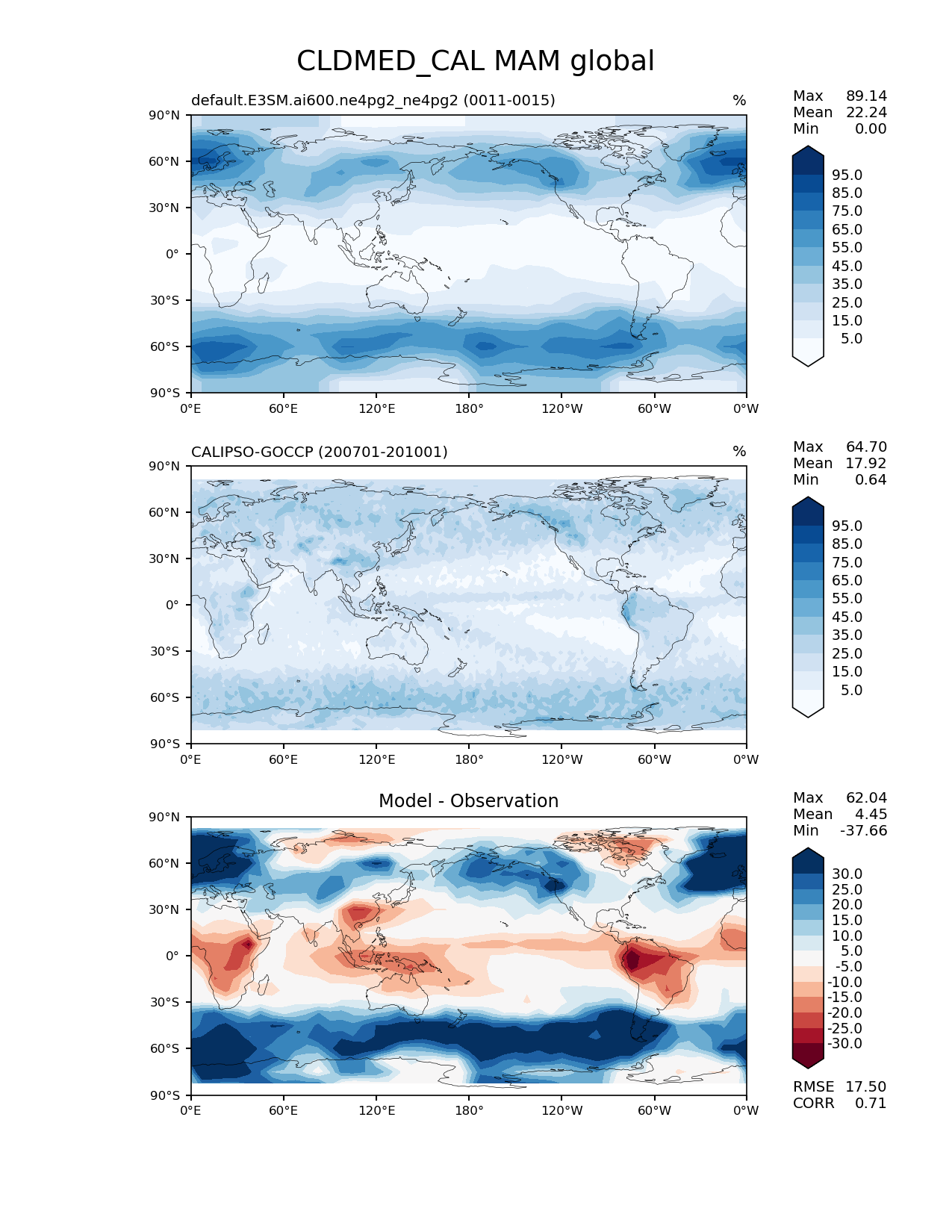Use this command to recreate this image: | e3sm_diags lat_lon --no_viewer --case_id 'Cloud Calipso' --sets 'lat_lon' --run_type 'model_vs_obs' --variables 'CLDMED_CAL' --seasons 'MAM' --regions 'global' --regrid_tool 'esmf' --regrid_method 'conservative' --main_title 'CLDMED_CAL MAM global' --backend 'mpl' --output_format 'png' --canvas_size_w '1212' --canvas_size_h '1628' --figsize '8.5' '11.0' --dpi '150' --arrows --contour_levels '5' '15' '25' '35' '45' '55' '65' '75' '85' '95' --test_name 'default.E3SM.ai600.ne4pg2_ne4pg2' --test_colormap 'Blues' --ref_name 'CALIPSOCOSP' --reference_name 'CALIPSO-GOCCP' --reference_colormap 'Blues' --diff_title 'Model - Observation' --diff_colormap 'RdBu' --diff_levels '-30' '-25' '-20' '-15' '-10' '-5' '5' '10' '15' '20' '25' '30' --multiprocessing --num_workers '32' --granulate 'variables' 'seasons' 'plevs' 'regions' --selectors 'sets' 'seasons' --reference_data_path '/global/cfs/cdirs/e3sm/acme_diags/obs_for_e3sm_diags/climatology/' --test_data_path '/global/cfs/cdirs/e3sm/emulate/postproc_e3sm/slice/default.E3SM.ai600.ne4pg2_ne4pg2' --results_dir '/global/cfs/cdirs/e3sm/www/wagmanbe/slice/default.E3SM.ai600.ne4pg2_ne4pg2' |