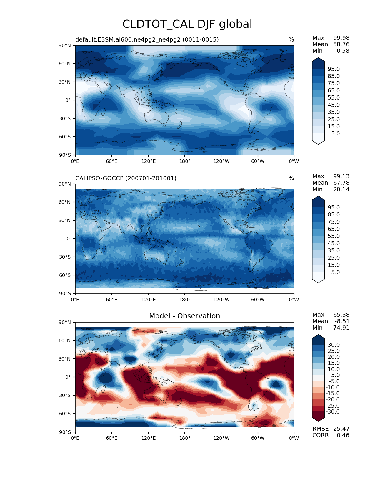 Use this command to recreate this image: | e3sm_diags lat_lon --no_viewer --case_id 'Cloud Calipso' --sets 'lat_lon' --run_type 'model_vs_obs' --variables 'CLDTOT_CAL' --seasons 'DJF' --regions 'global' --regrid_tool 'esmf' --regrid_method 'conservative' --main_title 'CLDTOT_CAL DJF global' --backend 'mpl' --output_format 'png' --canvas_size_w '1212' --canvas_size_h '1628' --figsize '8.5' '11.0' --dpi '150' --arrows --contour_levels '5' '15' '25' '35' '45' '55' '65' '75' '85' '95' --test_name 'default.E3SM.ai600.ne4pg2_ne4pg2' --test_colormap 'Blues' --ref_name 'CALIPSOCOSP' --reference_name 'CALIPSO-GOCCP' --reference_colormap 'Blues' --diff_title 'Model - Observation' --diff_colormap 'RdBu' --diff_levels '-30' '-25' '-20' '-15' '-10' '-5' '5' '10' '15' '20' '25' '30' --multiprocessing --num_workers '32' --granulate 'variables' 'seasons' 'plevs' 'regions' --selectors 'sets' 'seasons' --reference_data_path '/global/cfs/cdirs/e3sm/acme_diags/obs_for_e3sm_diags/climatology/' --test_data_path '/global/cfs/cdirs/e3sm/emulate/postproc_e3sm/slice/default.E3SM.ai600.ne4pg2_ne4pg2' --results_dir '/global/cfs/cdirs/e3sm/www/wagmanbe/slice/default.E3SM.ai600.ne4pg2_ne4pg2' |