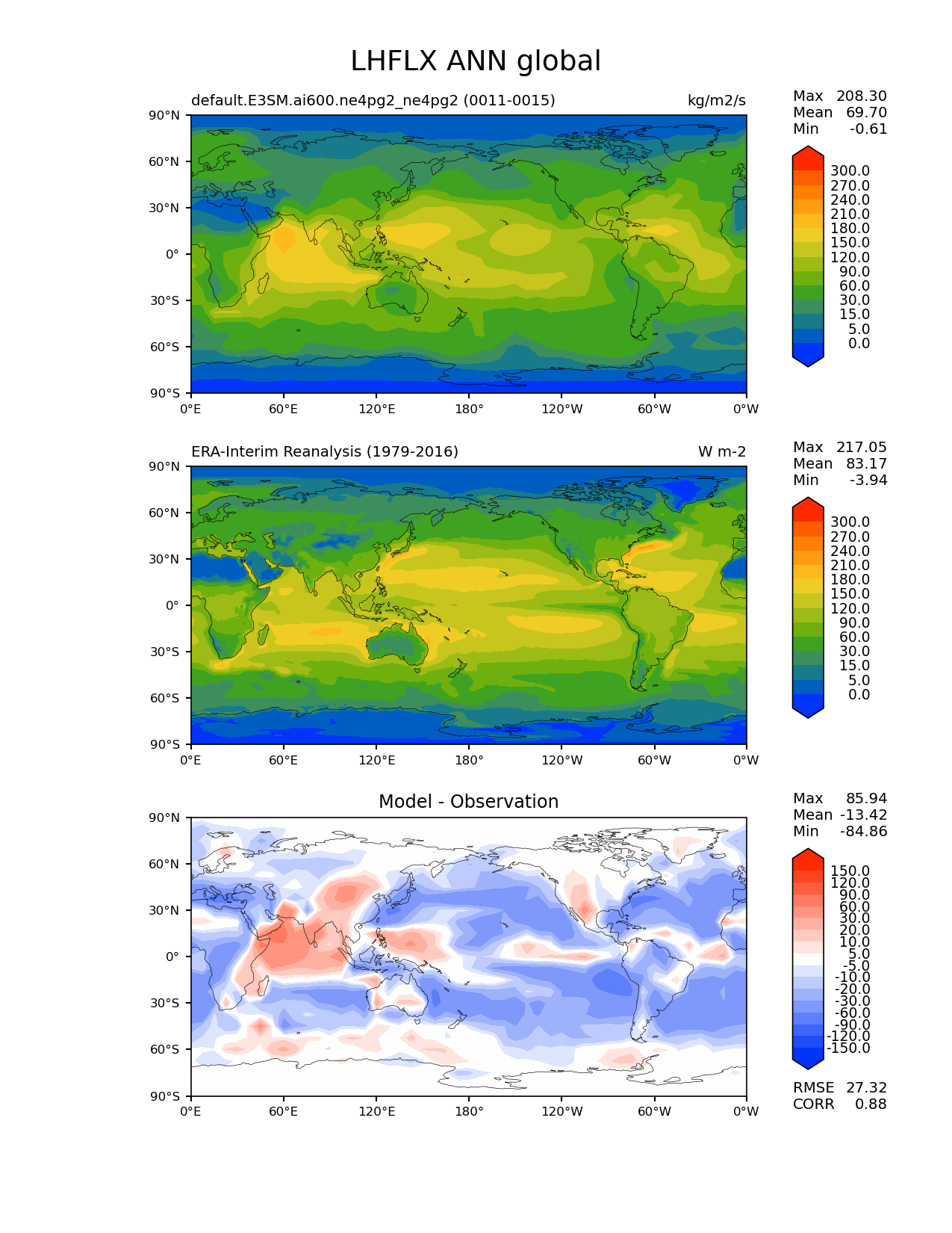 Use this command to recreate this image: | e3sm_diags lat_lon --no_viewer --case_id 'ERA-Interim' --sets 'lat_lon' --run_type 'model_vs_obs' --variables 'LHFLX' --seasons 'ANN' --regions 'global' --regrid_tool 'esmf' --regrid_method 'conservative' --main_title 'LHFLX ANN global' --backend 'mpl' --output_format 'png' --canvas_size_w '1212' --canvas_size_h '1628' --figsize '8.5' '11.0' --dpi '150' --arrows --contour_levels '0' '5' '15' '30' '60' '90' '120' '150' '180' '210' '240' '270' '300' --test_name 'default.E3SM.ai600.ne4pg2_ne4pg2' --test_colormap 'cet_rainbow.rgb' --ref_name 'ERA-Interim' --reference_name 'ERA-Interim Reanalysis' --reference_colormap 'cet_rainbow.rgb' --diff_title 'Model - Observation' --diff_colormap 'diverging_bwr.rgb' --diff_levels '-150' '-120' '-90' '-60' '-30' '-20' '-10' '-5' '5' '10' '20' '30' '60' '90' '120' '150' --multiprocessing --num_workers '32' --granulate 'variables' 'seasons' 'plevs' 'regions' --selectors 'sets' 'seasons' --reference_data_path '/global/cfs/cdirs/e3sm/acme_diags/obs_for_e3sm_diags/climatology/' --test_data_path '/global/cfs/cdirs/e3sm/emulate/postproc_e3sm/slice/default.E3SM.ai600.ne4pg2_ne4pg2' --results_dir '/global/cfs/cdirs/e3sm/www/wagmanbe/slice/default.E3SM.ai600.ne4pg2_ne4pg2' |