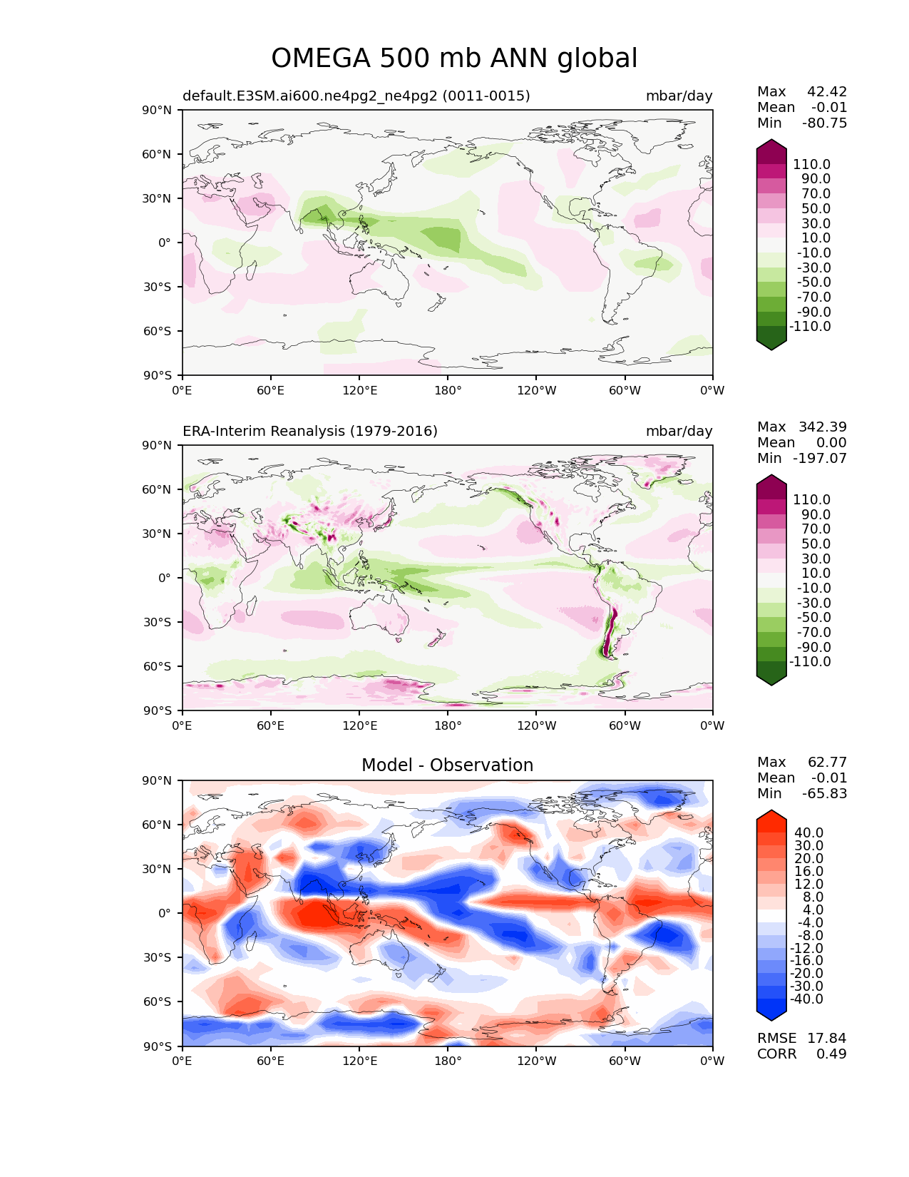 Use this command to recreate this image: | e3sm_diags lat_lon --no_viewer --case_id 'ERA-Interim' --sets 'lat_lon' --run_type 'model_vs_obs' --variables 'OMEGA' --seasons 'ANN' --regions 'global' --regrid_tool 'esmf' --regrid_method 'conservative' --plevs '500.0' --main_title 'OMEGA 500 mb ANN global' --backend 'mpl' --output_format 'png' --canvas_size_w '1212' --canvas_size_h '1628' --figsize '8.5' '11.0' --dpi '150' --arrows --contour_levels '-110' '-90' '-70' '-50' '-30' '-10' '10' '30' '50' '70' '90' '110' --test_name 'default.E3SM.ai600.ne4pg2_ne4pg2' --test_colormap 'PiYG_r' --ref_name 'ERA-Interim' --reference_name 'ERA-Interim Reanalysis' --reference_colormap 'PiYG_r' --diff_title 'Model - Observation' --diff_colormap 'diverging_bwr.rgb' --diff_levels '-40' '-30' '-20' '-16' '-12' '-8' '-4' '4' '8' '12' '16' '20' '30' '40' --multiprocessing --num_workers '32' --granulate 'variables' 'seasons' 'plevs' 'regions' --selectors 'sets' 'seasons' --reference_data_path '/global/cfs/cdirs/e3sm/acme_diags/obs_for_e3sm_diags/climatology/' --test_data_path '/global/cfs/cdirs/e3sm/emulate/postproc_e3sm/slice/default.E3SM.ai600.ne4pg2_ne4pg2' --results_dir '/global/cfs/cdirs/e3sm/www/wagmanbe/slice/default.E3SM.ai600.ne4pg2_ne4pg2' |