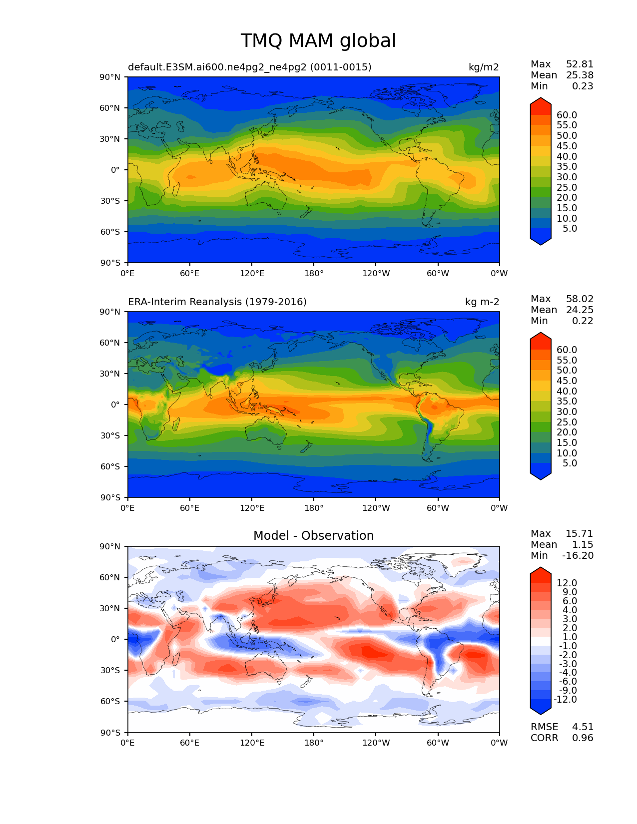 Use this command to recreate this image: | e3sm_diags lat_lon --no_viewer --case_id 'ERA-Interim' --sets 'lat_lon' --run_type 'model_vs_obs' --variables 'TMQ' --seasons 'MAM' --regions 'global' --regrid_tool 'esmf' --regrid_method 'conservative' --main_title 'TMQ MAM global' --backend 'mpl' --output_format 'png' --canvas_size_w '1212' --canvas_size_h '1628' --figsize '8.5' '11.0' --dpi '150' --arrows --contour_levels '5' '10' '15' '20' '25' '30' '35' '40' '45' '50' '55' '60' --test_name 'default.E3SM.ai600.ne4pg2_ne4pg2' --test_colormap 'cet_rainbow.rgb' --ref_name 'ERA-Interim' --reference_name 'ERA-Interim Reanalysis' --reference_colormap 'cet_rainbow.rgb' --diff_title 'Model - Observation' --diff_colormap 'diverging_bwr.rgb' --diff_levels '-12' '-9' '-6' '-4' '-3' '-2' '-1' '1' '2' '3' '4' '6' '9' '12' --multiprocessing --num_workers '32' --granulate 'variables' 'seasons' 'plevs' 'regions' --selectors 'sets' 'seasons' --reference_data_path '/global/cfs/cdirs/e3sm/acme_diags/obs_for_e3sm_diags/climatology/' --test_data_path '/global/cfs/cdirs/e3sm/emulate/postproc_e3sm/slice/default.E3SM.ai600.ne4pg2_ne4pg2' --results_dir '/global/cfs/cdirs/e3sm/www/wagmanbe/slice/default.E3SM.ai600.ne4pg2_ne4pg2' |