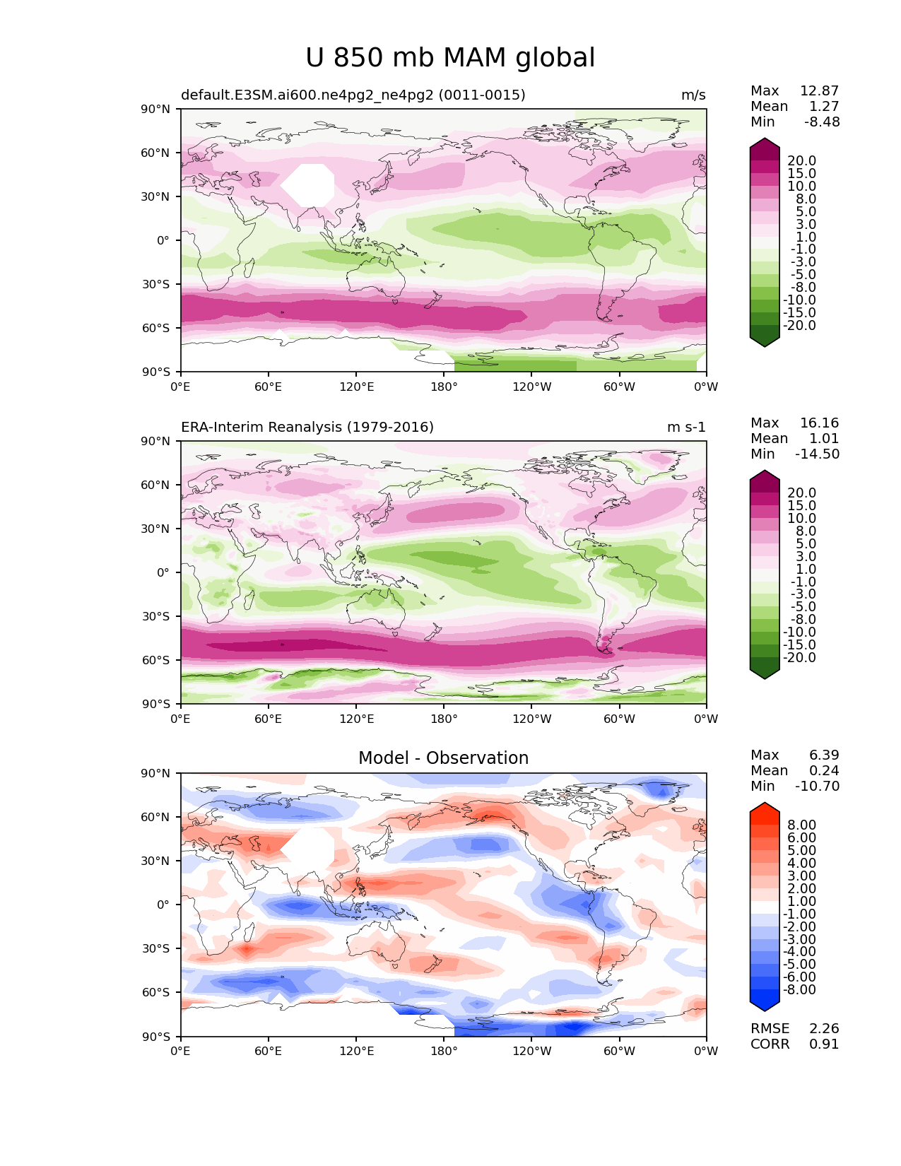 Use this command to recreate this image: | e3sm_diags lat_lon --no_viewer --case_id 'ERA-Interim' --sets 'lat_lon' --run_type 'model_vs_obs' --variables 'U' --seasons 'MAM' --regions 'global' --regrid_tool 'esmf' --regrid_method 'conservative' --plevs '850.0' --main_title 'U 850 mb MAM global' --backend 'mpl' --output_format 'png' --canvas_size_w '1212' --canvas_size_h '1628' --figsize '8.5' '11.0' --dpi '150' --arrows --contour_levels '-20' '-15' '-10' '-8' '-5' '-3' '-1' '1' '3' '5' '8' '10' '15' '20' --test_name 'default.E3SM.ai600.ne4pg2_ne4pg2' --test_colormap 'PiYG_r' --ref_name 'ERA-Interim' --reference_name 'ERA-Interim Reanalysis' --reference_colormap 'PiYG_r' --diff_title 'Model - Observation' --diff_colormap 'diverging_bwr.rgb' --diff_levels '-8' '-6' '-5' '-4' '-3' '-2' '-1' '1' '2' '3' '4' '5' '6' '8' --multiprocessing --num_workers '32' --granulate 'variables' 'seasons' 'plevs' 'regions' --selectors 'sets' 'seasons' --reference_data_path '/global/cfs/cdirs/e3sm/acme_diags/obs_for_e3sm_diags/climatology/' --test_data_path '/global/cfs/cdirs/e3sm/emulate/postproc_e3sm/slice/default.E3SM.ai600.ne4pg2_ne4pg2' --results_dir '/global/cfs/cdirs/e3sm/www/wagmanbe/slice/default.E3SM.ai600.ne4pg2_ne4pg2' |