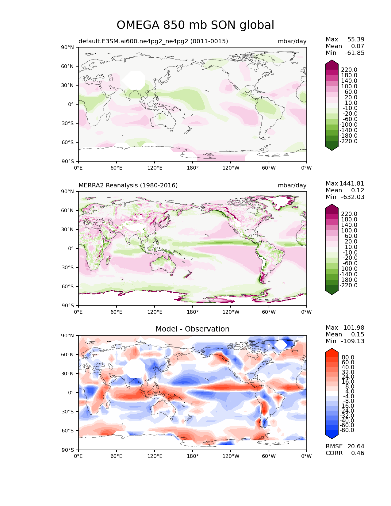 Use this command to recreate this image: | e3sm_diags lat_lon --no_viewer --case_id 'MERRA2' --sets 'lat_lon' --run_type 'model_vs_obs' --variables 'OMEGA' --seasons 'SON' --regions 'global' --regrid_tool 'esmf' --regrid_method 'conservative' --plevs '850.0' --main_title 'OMEGA 850 mb SON global' --backend 'mpl' --output_format 'png' --canvas_size_w '1212' --canvas_size_h '1628' --figsize '8.5' '11.0' --dpi '150' --arrows --contour_levels '-220' '-180' '-140' '-100' '-60' '-20' '-10' '10' '20' '60' '100' '140' '180' '220' --test_name 'default.E3SM.ai600.ne4pg2_ne4pg2' --test_colormap 'PiYG_r' --ref_name 'MERRA2' --reference_name 'MERRA2 Reanalysis' --reference_colormap 'PiYG_r' --diff_title 'Model - Observation' --diff_colormap 'diverging_bwr.rgb' --diff_levels '-80' '-60' '-40' '-32' '-24' '-16' '-8' '-4' '4' '8' '16' '24' '32' '40' '60' '80' --multiprocessing --num_workers '32' --granulate 'variables' 'seasons' 'plevs' 'regions' --selectors 'sets' 'seasons' --reference_data_path '/global/cfs/cdirs/e3sm/acme_diags/obs_for_e3sm_diags/climatology/' --test_data_path '/global/cfs/cdirs/e3sm/emulate/postproc_e3sm/slice/default.E3SM.ai600.ne4pg2_ne4pg2' --results_dir '/global/cfs/cdirs/e3sm/www/wagmanbe/slice/default.E3SM.ai600.ne4pg2_ne4pg2' |