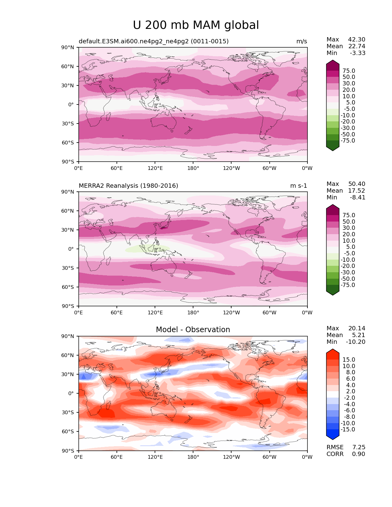 Use this command to recreate this image: | e3sm_diags lat_lon --no_viewer --case_id 'MERRA2' --sets 'lat_lon' --run_type 'model_vs_obs' --variables 'U' --seasons 'MAM' --regions 'global' --regrid_tool 'esmf' --regrid_method 'conservative' --plevs '200.0' --main_title 'U 200 mb MAM global' --backend 'mpl' --output_format 'png' --canvas_size_w '1212' --canvas_size_h '1628' --figsize '8.5' '11.0' --dpi '150' --arrows --contour_levels '-75' '-50' '-30' '-20' '-10' '-5' '5' '10' '20' '30' '50' '75' --test_name 'default.E3SM.ai600.ne4pg2_ne4pg2' --test_colormap 'PiYG_r' --ref_name 'MERRA2' --reference_name 'MERRA2 Reanalysis' --reference_colormap 'PiYG_r' --diff_title 'Model - Observation' --diff_colormap 'diverging_bwr.rgb' --diff_levels '-15' '-10' '-8' '-6' '-4' '-2' '2' '4' '6' '8' '10' '15' --multiprocessing --num_workers '32' --granulate 'variables' 'seasons' 'plevs' 'regions' --selectors 'sets' 'seasons' --reference_data_path '/global/cfs/cdirs/e3sm/acme_diags/obs_for_e3sm_diags/climatology/' --test_data_path '/global/cfs/cdirs/e3sm/emulate/postproc_e3sm/slice/default.E3SM.ai600.ne4pg2_ne4pg2' --results_dir '/global/cfs/cdirs/e3sm/www/wagmanbe/slice/default.E3SM.ai600.ne4pg2_ne4pg2' |