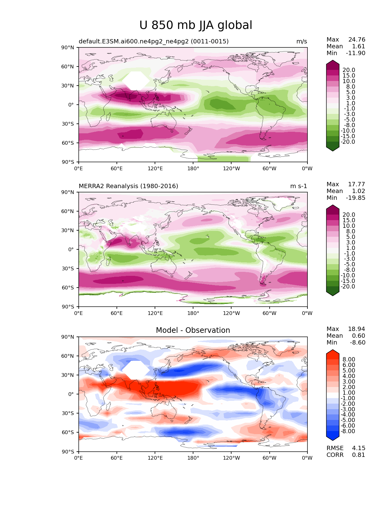 Use this command to recreate this image: | e3sm_diags lat_lon --no_viewer --case_id 'MERRA2' --sets 'lat_lon' --run_type 'model_vs_obs' --variables 'U' --seasons 'JJA' --regions 'global' --regrid_tool 'esmf' --regrid_method 'conservative' --plevs '850.0' --main_title 'U 850 mb JJA global' --backend 'mpl' --output_format 'png' --canvas_size_w '1212' --canvas_size_h '1628' --figsize '8.5' '11.0' --dpi '150' --arrows --contour_levels '-20' '-15' '-10' '-8' '-5' '-3' '-1' '1' '3' '5' '8' '10' '15' '20' --test_name 'default.E3SM.ai600.ne4pg2_ne4pg2' --test_colormap 'PiYG_r' --ref_name 'MERRA2' --reference_name 'MERRA2 Reanalysis' --reference_colormap 'PiYG_r' --diff_title 'Model - Observation' --diff_colormap 'diverging_bwr.rgb' --diff_levels '-8' '-6' '-5' '-4' '-3' '-2' '-1' '1' '2' '3' '4' '5' '6' '8' --multiprocessing --num_workers '32' --granulate 'variables' 'seasons' 'plevs' 'regions' --selectors 'sets' 'seasons' --reference_data_path '/global/cfs/cdirs/e3sm/acme_diags/obs_for_e3sm_diags/climatology/' --test_data_path '/global/cfs/cdirs/e3sm/emulate/postproc_e3sm/slice/default.E3SM.ai600.ne4pg2_ne4pg2' --results_dir '/global/cfs/cdirs/e3sm/www/wagmanbe/slice/default.E3SM.ai600.ne4pg2_ne4pg2' |