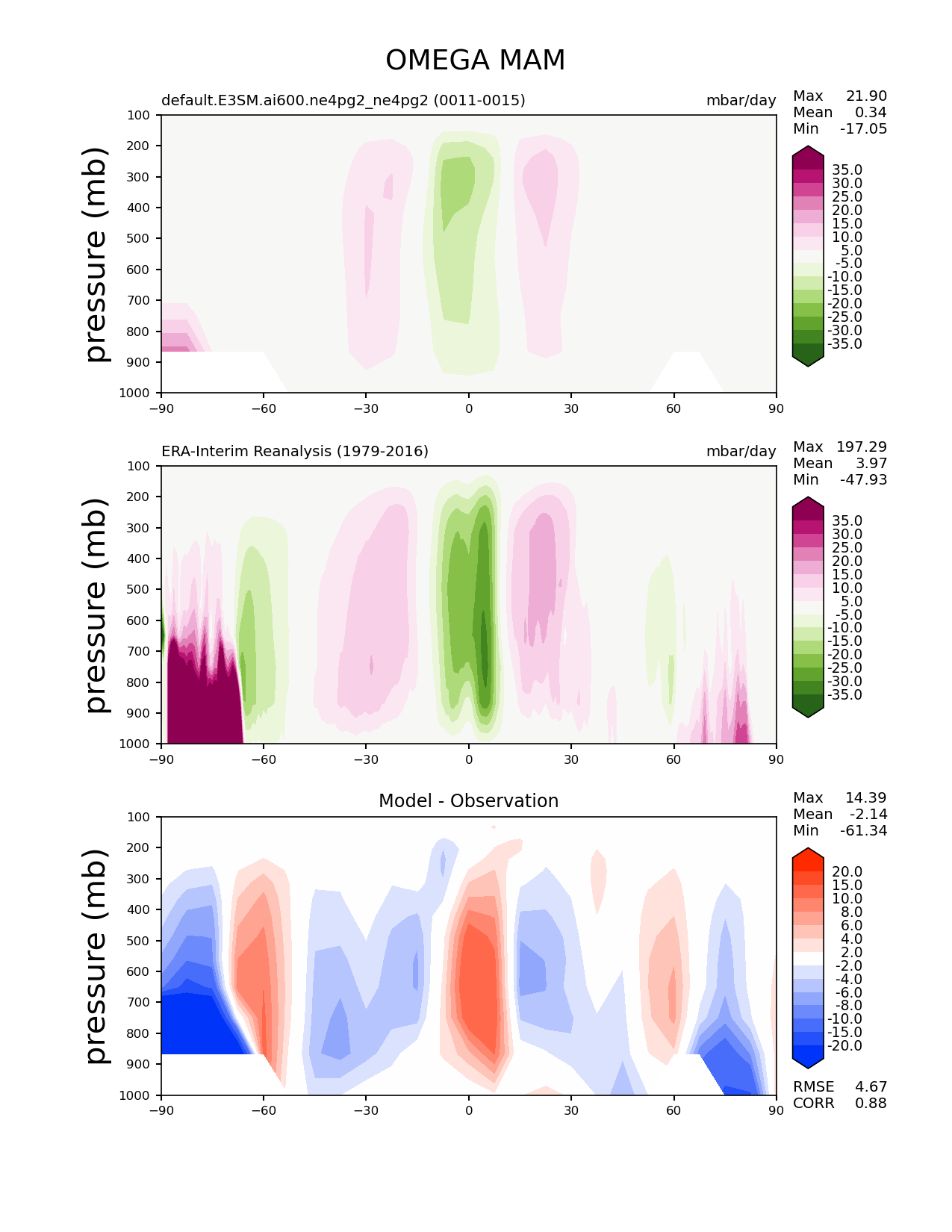 Use this command to recreate this image: | e3sm_diags zonal_mean_2d --no_viewer --case_id 'ERA-Interim' --sets 'zonal_mean_2d' --run_type 'model_vs_obs' --variables 'OMEGA' --seasons 'MAM' --regions 'global' --regrid_tool 'esmf' --regrid_method 'conservative' --plevs '100.0' '115.47819846894582' '133.3521432163324' '153.9926526059492' '177.82794100389228' '205.3525026457146' '237.13737056616552' '273.8419634264361' '316.22776601683796' '365.1741272548377' '421.6965034285823' '486.9675251658631' '562.341325190349' '649.3816315762114' '749.8942093324558' '865.9643233600654' '1000.0' --main_title 'OMEGA MAM' --backend 'mpl' --output_format 'png' --canvas_size_w '1212' --canvas_size_h '1628' --figsize '8.5' '11.0' --dpi '150' --arrows --contour_levels '-35' '-30' '-25' '-20' '-15' '-10' '-5' '5' '10' '15' '20' '25' '30' '35' --test_name 'default.E3SM.ai600.ne4pg2_ne4pg2' --test_colormap 'PiYG_r' --ref_name 'ERA-Interim' --reference_name 'ERA-Interim Reanalysis' --reference_colormap 'PiYG_r' --diff_title 'Model - Observation' --diff_colormap 'diverging_bwr.rgb' --diff_levels '-20' '-15' '-10' '-8' '-6' '-4' '-2' '2' '4' '6' '8' '10' '15' '20' --multiprocessing --num_workers '32' --granulate 'variables' 'seasons' 'regions' --selectors 'sets' 'seasons' --reference_data_path '/global/cfs/cdirs/e3sm/acme_diags/obs_for_e3sm_diags/climatology/' --test_data_path '/global/cfs/cdirs/e3sm/emulate/postproc_e3sm/slice/default.E3SM.ai600.ne4pg2_ne4pg2' --results_dir '/global/cfs/cdirs/e3sm/www/wagmanbe/slice/default.E3SM.ai600.ne4pg2_ne4pg2' |