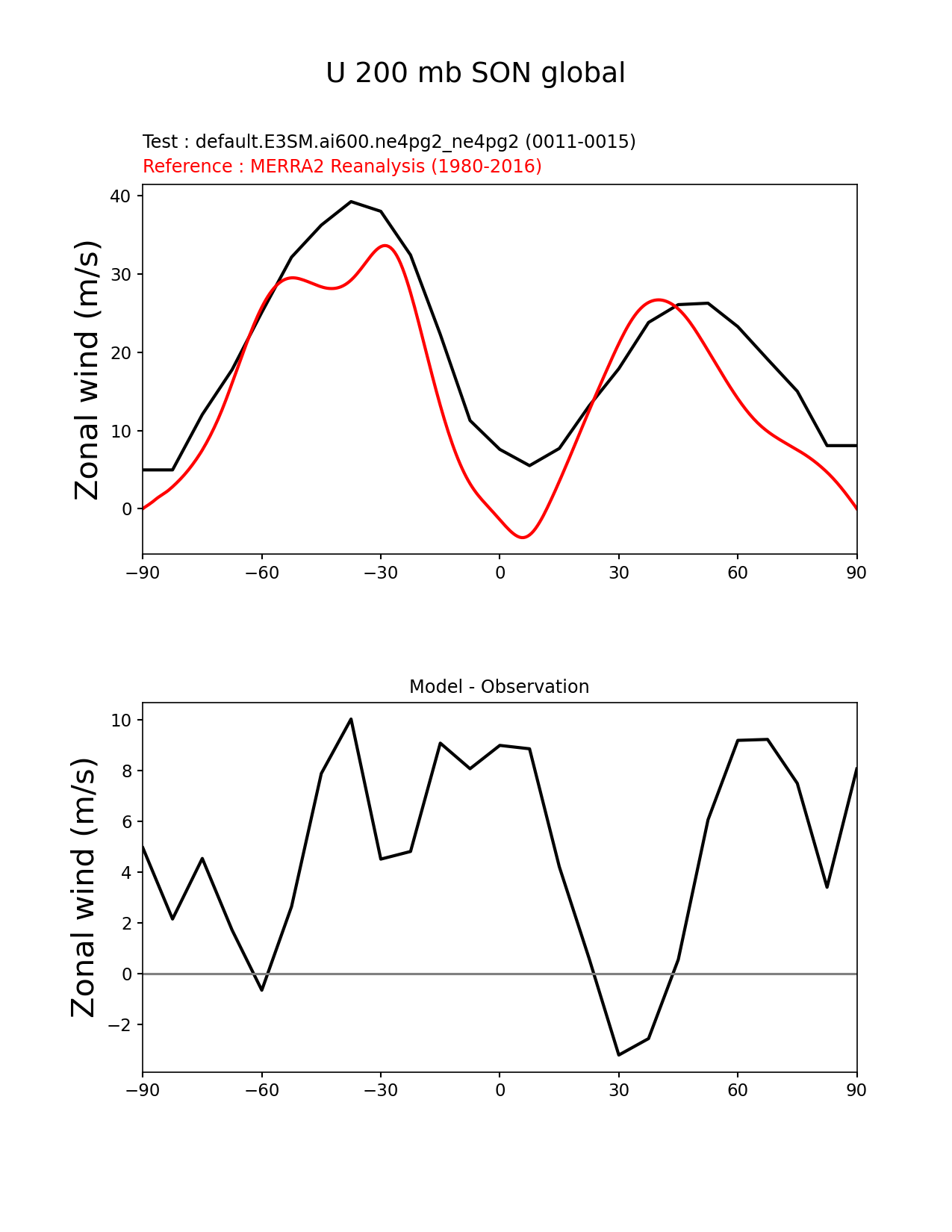 Use this command to recreate this image: | e3sm_diags zonal_mean_xy --no_viewer --case_id 'MERRA2' --sets 'zonal_mean_xy' --run_type 'model_vs_obs' --variables 'U' --seasons 'SON' --regions 'global' --regrid_tool 'esmf' --regrid_method 'conservative' --plevs '200.0' --main_title 'U 200 mb SON global' --backend 'mpl' --output_format 'png' --canvas_size_w '1212' --canvas_size_h '1628' --figsize '8.5' '11.0' --dpi '150' --arrows --test_name 'default.E3SM.ai600.ne4pg2_ne4pg2' --test_colormap 'cet_rainbow.rgb' --ref_name 'MERRA2' --reference_name 'MERRA2 Reanalysis' --reference_colormap 'cet_rainbow.rgb' --diff_title 'Model - Observation' --diff_colormap 'diverging_bwr.rgb' --multiprocessing --num_workers '32' --granulate 'variables' 'seasons' 'plevs' 'regions' --selectors 'sets' 'seasons' --reference_data_path '/global/cfs/cdirs/e3sm/acme_diags/obs_for_e3sm_diags/climatology/' --test_data_path '/global/cfs/cdirs/e3sm/emulate/postproc_e3sm/slice/default.E3SM.ai600.ne4pg2_ne4pg2' --results_dir '/global/cfs/cdirs/e3sm/www/wagmanbe/slice/default.E3SM.ai600.ne4pg2_ne4pg2' |