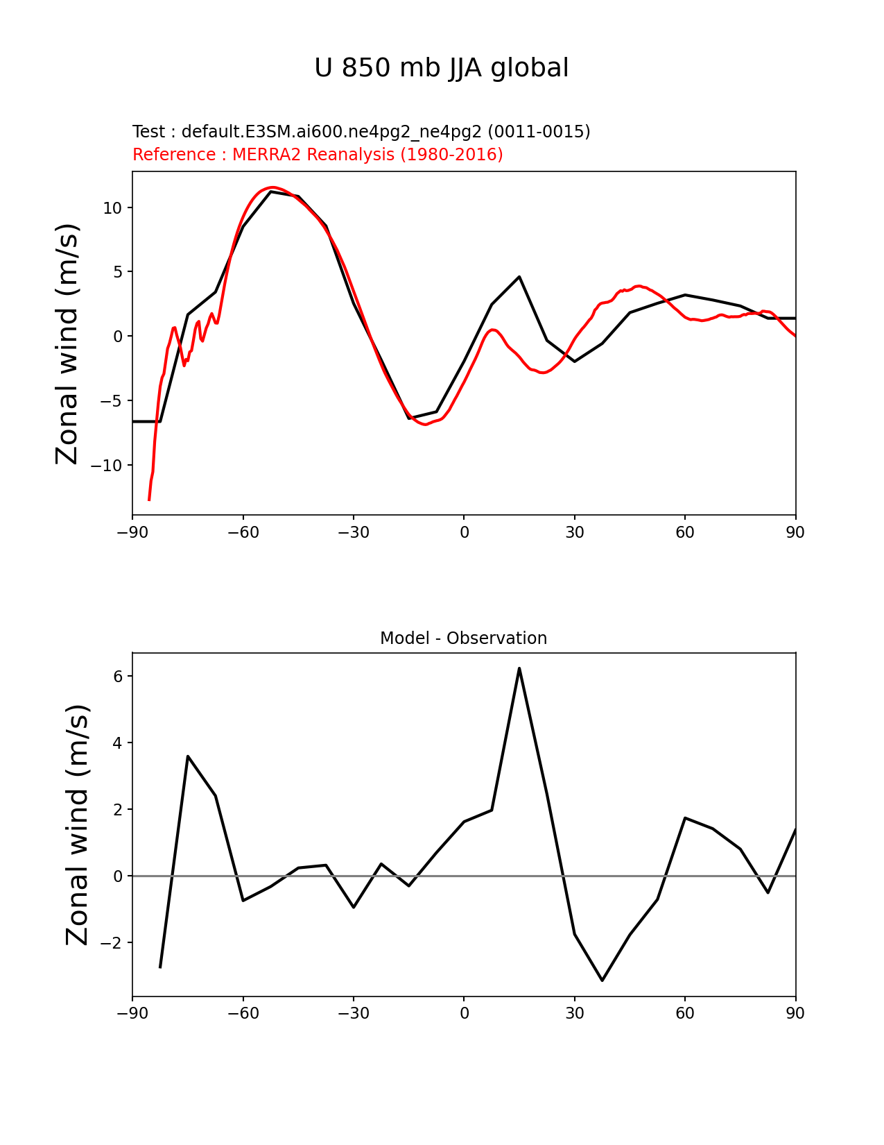 Use this command to recreate this image: | e3sm_diags zonal_mean_xy --no_viewer --case_id 'MERRA2' --sets 'zonal_mean_xy' --run_type 'model_vs_obs' --variables 'U' --seasons 'JJA' --regions 'global' --regrid_tool 'esmf' --regrid_method 'conservative' --plevs '850' --main_title 'U 850 mb JJA global' --backend 'mpl' --output_format 'png' --canvas_size_w '1212' --canvas_size_h '1628' --figsize '8.5' '11.0' --dpi '150' --arrows --test_name 'default.E3SM.ai600.ne4pg2_ne4pg2' --test_colormap 'cet_rainbow.rgb' --ref_name 'MERRA2' --reference_name 'MERRA2 Reanalysis' --reference_colormap 'cet_rainbow.rgb' --diff_title 'Model - Observation' --diff_colormap 'diverging_bwr.rgb' --multiprocessing --num_workers '32' --granulate 'variables' 'seasons' 'plevs' 'regions' --selectors 'sets' 'seasons' --reference_data_path '/global/cfs/cdirs/e3sm/acme_diags/obs_for_e3sm_diags/climatology/' --test_data_path '/global/cfs/cdirs/e3sm/emulate/postproc_e3sm/slice/default.E3SM.ai600.ne4pg2_ne4pg2' --results_dir '/global/cfs/cdirs/e3sm/www/wagmanbe/slice/default.E3SM.ai600.ne4pg2_ne4pg2' |