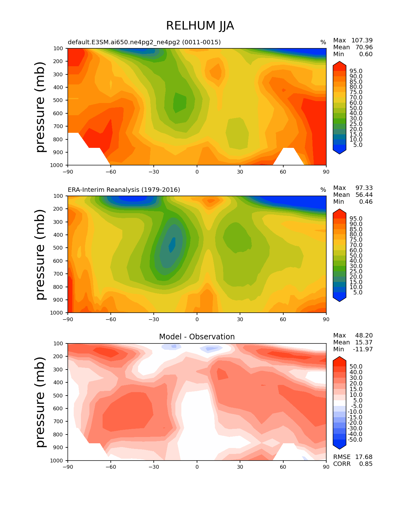 Use this command to recreate this image: | e3sm_diags zonal_mean_2d --no_viewer --case_id 'ERA-Interim' --sets 'zonal_mean_2d' --run_type 'model_vs_obs' --variables 'RELHUM' --seasons 'JJA' --regions 'global' --regrid_tool 'esmf' --regrid_method 'conservative' --plevs '100.0' '115.47819846894582' '133.3521432163324' '153.9926526059492' '177.82794100389228' '205.3525026457146' '237.13737056616552' '273.8419634264361' '316.22776601683796' '365.1741272548377' '421.6965034285823' '486.9675251658631' '562.341325190349' '649.3816315762114' '749.8942093324558' '865.9643233600654' '1000.0' --main_title 'RELHUM JJA' --backend 'mpl' --output_format 'png' --canvas_size_w '1212' --canvas_size_h '1628' --figsize '8.5' '11.0' --dpi '150' --arrows --contour_levels '5' '10' '15' '20' '25' '30' '40' '50' '60' '70' '75' '80' '85' '90' '95' --test_name 'default.E3SM.ai650.ne4pg2_ne4pg2' --test_colormap 'cet_rainbow.rgb' --ref_name 'ERA-Interim' --reference_name 'ERA-Interim Reanalysis' --reference_colormap 'cet_rainbow.rgb' --diff_title 'Model - Observation' --diff_colormap 'diverging_bwr.rgb' --diff_levels '-50' '-40' '-30' '-20' '-15' '-10' '-5' '5' '10' '15' '20' '30' '40' '50' --multiprocessing --num_workers '32' --granulate 'variables' 'seasons' 'regions' --selectors 'sets' 'seasons' --reference_data_path '/global/cfs/cdirs/e3sm/acme_diags/obs_for_e3sm_diags/climatology/' --test_data_path '/global/cfs/cdirs/e3sm/emulate/postproc_e3sm/slice/default.E3SM.ai650.ne4pg2_ne4pg2' --results_dir '/global/cfs/cdirs/e3sm/www/wagmanbe/slice/default.E3SM.ai650.ne4pg2_ne4pg2' |