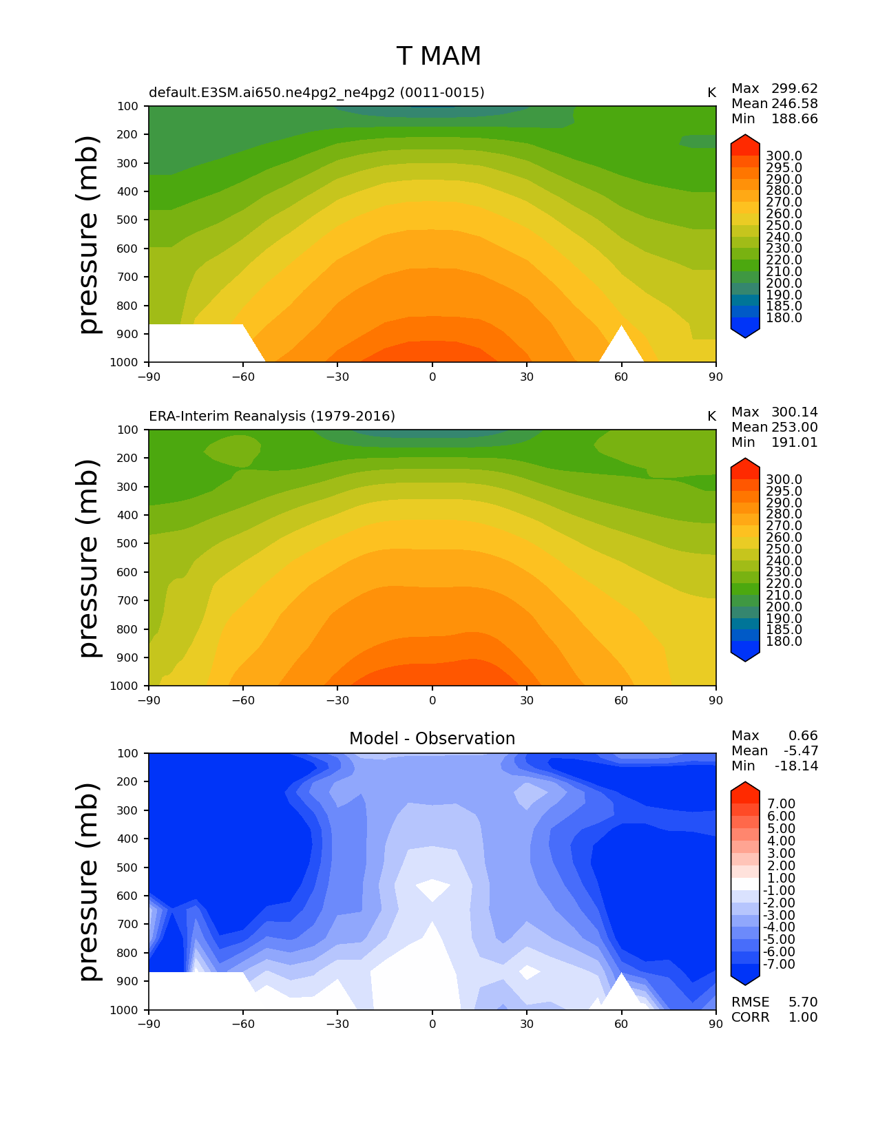 Use this command to recreate this image: | e3sm_diags zonal_mean_2d --no_viewer --case_id 'ERA-Interim' --sets 'zonal_mean_2d' --run_type 'model_vs_obs' --variables 'T' --seasons 'MAM' --regions 'global' --regrid_tool 'esmf' --regrid_method 'conservative' --plevs '100.0' '115.47819846894582' '133.3521432163324' '153.9926526059492' '177.82794100389228' '205.3525026457146' '237.13737056616552' '273.8419634264361' '316.22776601683796' '365.1741272548377' '421.6965034285823' '486.9675251658631' '562.341325190349' '649.3816315762114' '749.8942093324558' '865.9643233600654' '1000.0' --main_title 'T MAM' --backend 'mpl' --output_format 'png' --canvas_size_w '1212' --canvas_size_h '1628' --figsize '8.5' '11.0' --dpi '150' --arrows --contour_levels '180' '185' '190' '200' '210' '220' '230' '240' '250' '260' '270' '280' '290' '295' '300' --test_name 'default.E3SM.ai650.ne4pg2_ne4pg2' --test_colormap 'cet_rainbow.rgb' --ref_name 'ERA-Interim' --reference_name 'ERA-Interim Reanalysis' --reference_colormap 'cet_rainbow.rgb' --diff_title 'Model - Observation' --diff_colormap 'diverging_bwr.rgb' --diff_levels '-7' '-6' '-5' '-4' '-3' '-2' '-1' '1' '2' '3' '4' '5' '6' '7' --multiprocessing --num_workers '32' --granulate 'variables' 'seasons' 'regions' --selectors 'sets' 'seasons' --reference_data_path '/global/cfs/cdirs/e3sm/acme_diags/obs_for_e3sm_diags/climatology/' --test_data_path '/global/cfs/cdirs/e3sm/emulate/postproc_e3sm/slice/default.E3SM.ai650.ne4pg2_ne4pg2' --results_dir '/global/cfs/cdirs/e3sm/www/wagmanbe/slice/default.E3SM.ai650.ne4pg2_ne4pg2' |