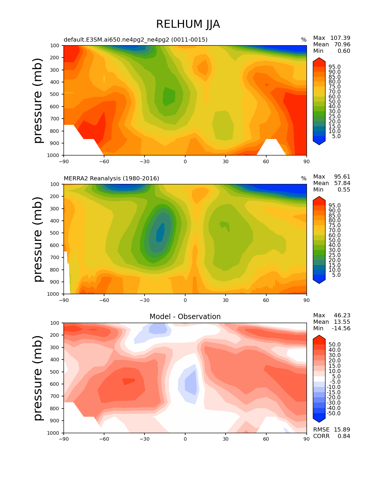 Use this command to recreate this image: | e3sm_diags zonal_mean_2d --no_viewer --case_id 'MERRA2' --sets 'zonal_mean_2d' --run_type 'model_vs_obs' --variables 'RELHUM' --seasons 'JJA' --regions 'global' --regrid_tool 'esmf' --regrid_method 'conservative' --plevs '100.0' '115.47819846894582' '133.3521432163324' '153.9926526059492' '177.82794100389228' '205.3525026457146' '237.13737056616552' '273.8419634264361' '316.22776601683796' '365.1741272548377' '421.6965034285823' '486.9675251658631' '562.341325190349' '649.3816315762114' '749.8942093324558' '865.9643233600654' '1000.0' --main_title 'RELHUM JJA' --backend 'mpl' --output_format 'png' --canvas_size_w '1212' --canvas_size_h '1628' --figsize '8.5' '11.0' --dpi '150' --arrows --contour_levels '5' '10' '15' '20' '25' '30' '40' '50' '60' '70' '75' '80' '85' '90' '95' --test_name 'default.E3SM.ai650.ne4pg2_ne4pg2' --test_colormap 'cet_rainbow.rgb' --ref_name 'MERRA2' --reference_name 'MERRA2 Reanalysis' --reference_colormap 'cet_rainbow.rgb' --diff_title 'Model - Observation' --diff_colormap 'diverging_bwr.rgb' --diff_levels '-50' '-40' '-30' '-20' '-15' '-10' '-5' '5' '10' '15' '20' '30' '40' '50' --multiprocessing --num_workers '32' --granulate 'variables' 'seasons' 'regions' --selectors 'sets' 'seasons' --reference_data_path '/global/cfs/cdirs/e3sm/acme_diags/obs_for_e3sm_diags/climatology/' --test_data_path '/global/cfs/cdirs/e3sm/emulate/postproc_e3sm/slice/default.E3SM.ai650.ne4pg2_ne4pg2' --results_dir '/global/cfs/cdirs/e3sm/www/wagmanbe/slice/default.E3SM.ai650.ne4pg2_ne4pg2' |