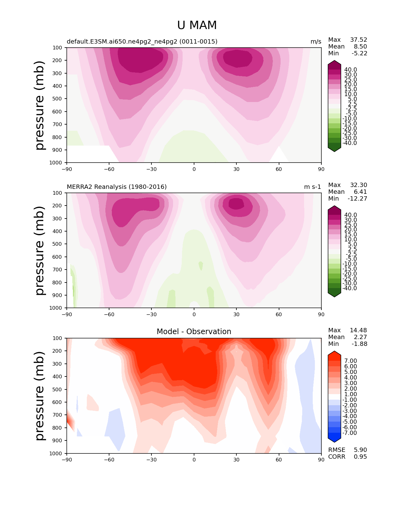 Use this command to recreate this image: | e3sm_diags zonal_mean_2d --no_viewer --case_id 'MERRA2' --sets 'zonal_mean_2d' --run_type 'model_vs_obs' --variables 'U' --seasons 'MAM' --regions 'global' --regrid_tool 'esmf' --regrid_method 'conservative' --plevs '100.0' '115.47819846894582' '133.3521432163324' '153.9926526059492' '177.82794100389228' '205.3525026457146' '237.13737056616552' '273.8419634264361' '316.22776601683796' '365.1741272548377' '421.6965034285823' '486.9675251658631' '562.341325190349' '649.3816315762114' '749.8942093324558' '865.9643233600654' '1000.0' --main_title 'U MAM' --backend 'mpl' --output_format 'png' --canvas_size_w '1212' --canvas_size_h '1628' --figsize '8.5' '11.0' --dpi '150' --arrows --contour_levels '-40' '-30' '-25' '-20' '-15' '-10' '-5' '-2.5' '2.5' '5' '10' '15' '20' '25' '30' '40' --test_name 'default.E3SM.ai650.ne4pg2_ne4pg2' --test_colormap 'PiYG_r' --ref_name 'MERRA2' --reference_name 'MERRA2 Reanalysis' --reference_colormap 'PiYG_r' --diff_title 'Model - Observation' --diff_colormap 'diverging_bwr.rgb' --diff_levels '-7' '-6' '-5' '-4' '-3' '-2' '-1' '1' '2' '3' '4' '5' '6' '7' --multiprocessing --num_workers '32' --granulate 'variables' 'seasons' 'regions' --selectors 'sets' 'seasons' --reference_data_path '/global/cfs/cdirs/e3sm/acme_diags/obs_for_e3sm_diags/climatology/' --test_data_path '/global/cfs/cdirs/e3sm/emulate/postproc_e3sm/slice/default.E3SM.ai650.ne4pg2_ne4pg2' --results_dir '/global/cfs/cdirs/e3sm/www/wagmanbe/slice/default.E3SM.ai650.ne4pg2_ne4pg2' |