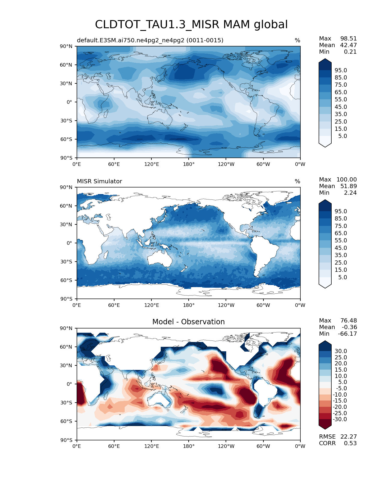 Use this command to recreate this image: | e3sm_diags lat_lon --no_viewer --case_id 'Cloud MISR' --sets 'lat_lon' --run_type 'model_vs_obs' --variables 'CLDTOT_TAU1.3_MISR' --seasons 'MAM' --regions 'global' --regrid_tool 'esmf' --regrid_method 'conservative' --main_title 'CLDTOT_TAU1.3_MISR MAM global' --backend 'mpl' --output_format 'png' --canvas_size_w '1212' --canvas_size_h '1628' --figsize '8.5' '11.0' --dpi '150' --arrows --contour_levels '5' '15' '25' '35' '45' '55' '65' '75' '85' '95' --test_name 'default.E3SM.ai750.ne4pg2_ne4pg2' --test_colormap 'Blues' --ref_name 'MISRCOSP' --reference_name 'MISR Simulator' --reference_colormap 'Blues' --diff_title 'Model - Observation' --diff_colormap 'RdBu' --diff_levels '-30' '-25' '-20' '-15' '-10' '-5' '5' '10' '15' '20' '25' '30' --multiprocessing --num_workers '32' --granulate 'variables' 'seasons' 'plevs' 'regions' --selectors 'sets' 'seasons' --reference_data_path '/global/cfs/cdirs/e3sm/acme_diags/obs_for_e3sm_diags/climatology/' --test_data_path '/global/cfs/cdirs/e3sm/emulate/postproc_e3sm/slice/default.E3SM.ai750.ne4pg2_ne4pg2' --results_dir '/global/cfs/cdirs/e3sm/www/wagmanbe/slice/default.E3SM.ai750.ne4pg2_ne4pg2' |