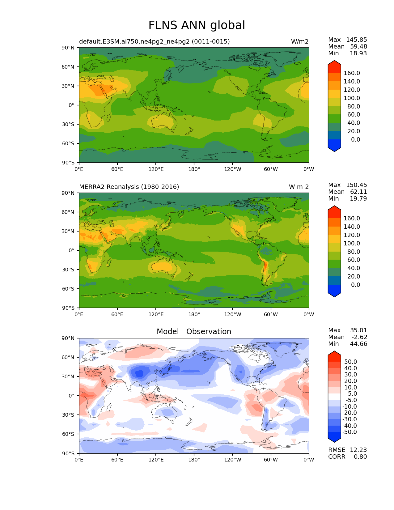 Use this command to recreate this image: | e3sm_diags lat_lon --no_viewer --case_id 'MERRA2' --sets 'lat_lon' --run_type 'model_vs_obs' --variables 'FLNS' --seasons 'ANN' --regions 'global' --regrid_tool 'esmf' --regrid_method 'conservative' --main_title 'FLNS ANN global' --backend 'mpl' --output_format 'png' --canvas_size_w '1212' --canvas_size_h '1628' --figsize '8.5' '11.0' --dpi '150' --arrows --contour_levels '0' '20' '40' '60' '80' '100' '120' '140' '160' --test_name 'default.E3SM.ai750.ne4pg2_ne4pg2' --test_colormap 'cet_rainbow.rgb' --ref_name 'MERRA2' --reference_name 'MERRA2 Reanalysis' --reference_colormap 'cet_rainbow.rgb' --diff_title 'Model - Observation' --diff_colormap 'diverging_bwr.rgb' --diff_levels '-50' '-40' '-30' '-20' '-10' '-5' '5' '10' '20' '30' '40' '50' --multiprocessing --num_workers '32' --granulate 'variables' 'seasons' 'plevs' 'regions' --selectors 'sets' 'seasons' --reference_data_path '/global/cfs/cdirs/e3sm/acme_diags/obs_for_e3sm_diags/climatology/' --test_data_path '/global/cfs/cdirs/e3sm/emulate/postproc_e3sm/slice/default.E3SM.ai750.ne4pg2_ne4pg2' --results_dir '/global/cfs/cdirs/e3sm/www/wagmanbe/slice/default.E3SM.ai750.ne4pg2_ne4pg2' |