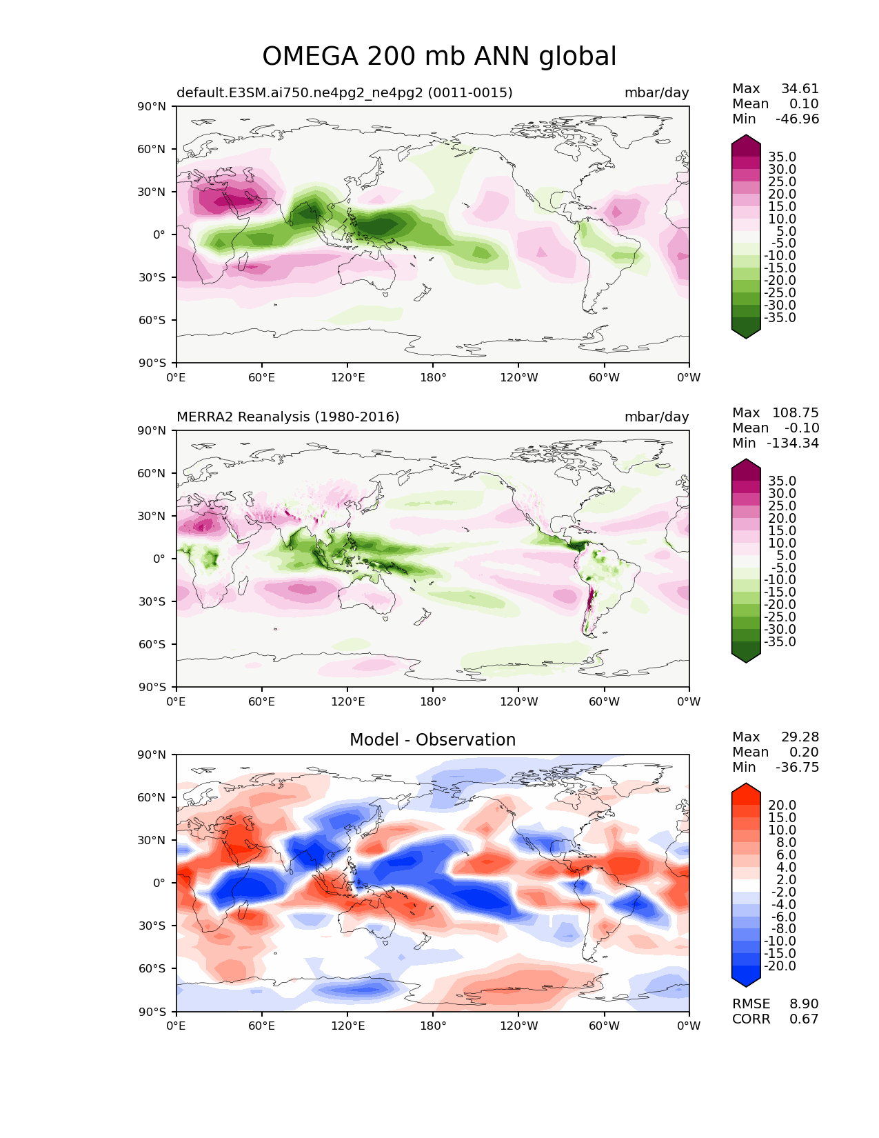 Use this command to recreate this image: | e3sm_diags lat_lon --no_viewer --case_id 'MERRA2' --sets 'lat_lon' --run_type 'model_vs_obs' --variables 'OMEGA' --seasons 'ANN' --regions 'global' --regrid_tool 'esmf' --regrid_method 'conservative' --plevs '200.0' --main_title 'OMEGA 200 mb ANN global' --backend 'mpl' --output_format 'png' --canvas_size_w '1212' --canvas_size_h '1628' --figsize '8.5' '11.0' --dpi '150' --arrows --contour_levels '-35' '-30' '-25' '-20' '-15' '-10' '-5' '5' '10' '15' '20' '25' '30' '35' --test_name 'default.E3SM.ai750.ne4pg2_ne4pg2' --test_colormap 'PiYG_r' --ref_name 'MERRA2' --reference_name 'MERRA2 Reanalysis' --reference_colormap 'PiYG_r' --diff_title 'Model - Observation' --diff_colormap 'diverging_bwr.rgb' --diff_levels '-20' '-15' '-10' '-8' '-6' '-4' '-2' '2' '4' '6' '8' '10' '15' '20' --multiprocessing --num_workers '32' --granulate 'variables' 'seasons' 'plevs' 'regions' --selectors 'sets' 'seasons' --reference_data_path '/global/cfs/cdirs/e3sm/acme_diags/obs_for_e3sm_diags/climatology/' --test_data_path '/global/cfs/cdirs/e3sm/emulate/postproc_e3sm/slice/default.E3SM.ai750.ne4pg2_ne4pg2' --results_dir '/global/cfs/cdirs/e3sm/www/wagmanbe/slice/default.E3SM.ai750.ne4pg2_ne4pg2' |