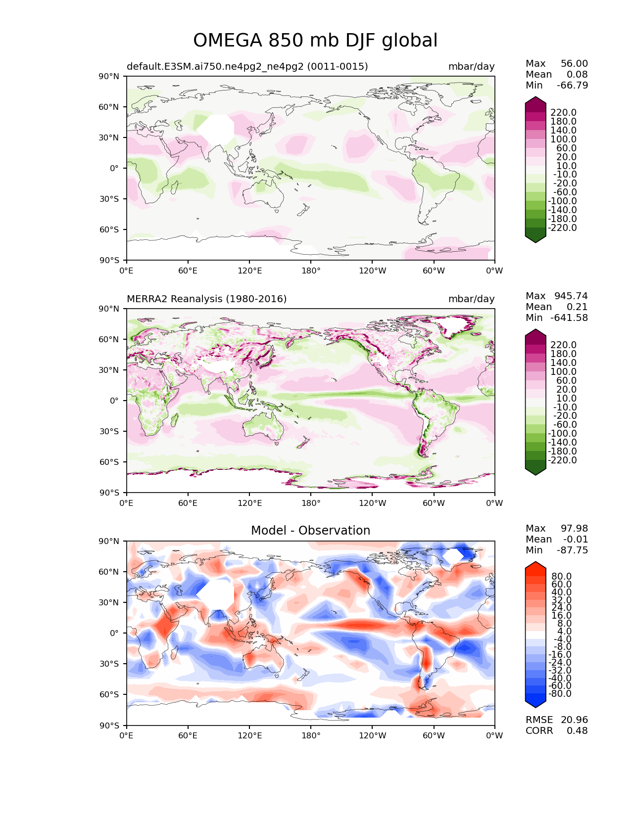 Use this command to recreate this image: | e3sm_diags lat_lon --no_viewer --case_id 'MERRA2' --sets 'lat_lon' --run_type 'model_vs_obs' --variables 'OMEGA' --seasons 'DJF' --regions 'global' --regrid_tool 'esmf' --regrid_method 'conservative' --plevs '850.0' --main_title 'OMEGA 850 mb DJF global' --backend 'mpl' --output_format 'png' --canvas_size_w '1212' --canvas_size_h '1628' --figsize '8.5' '11.0' --dpi '150' --arrows --contour_levels '-220' '-180' '-140' '-100' '-60' '-20' '-10' '10' '20' '60' '100' '140' '180' '220' --test_name 'default.E3SM.ai750.ne4pg2_ne4pg2' --test_colormap 'PiYG_r' --ref_name 'MERRA2' --reference_name 'MERRA2 Reanalysis' --reference_colormap 'PiYG_r' --diff_title 'Model - Observation' --diff_colormap 'diverging_bwr.rgb' --diff_levels '-80' '-60' '-40' '-32' '-24' '-16' '-8' '-4' '4' '8' '16' '24' '32' '40' '60' '80' --multiprocessing --num_workers '32' --granulate 'variables' 'seasons' 'plevs' 'regions' --selectors 'sets' 'seasons' --reference_data_path '/global/cfs/cdirs/e3sm/acme_diags/obs_for_e3sm_diags/climatology/' --test_data_path '/global/cfs/cdirs/e3sm/emulate/postproc_e3sm/slice/default.E3SM.ai750.ne4pg2_ne4pg2' --results_dir '/global/cfs/cdirs/e3sm/www/wagmanbe/slice/default.E3SM.ai750.ne4pg2_ne4pg2' |