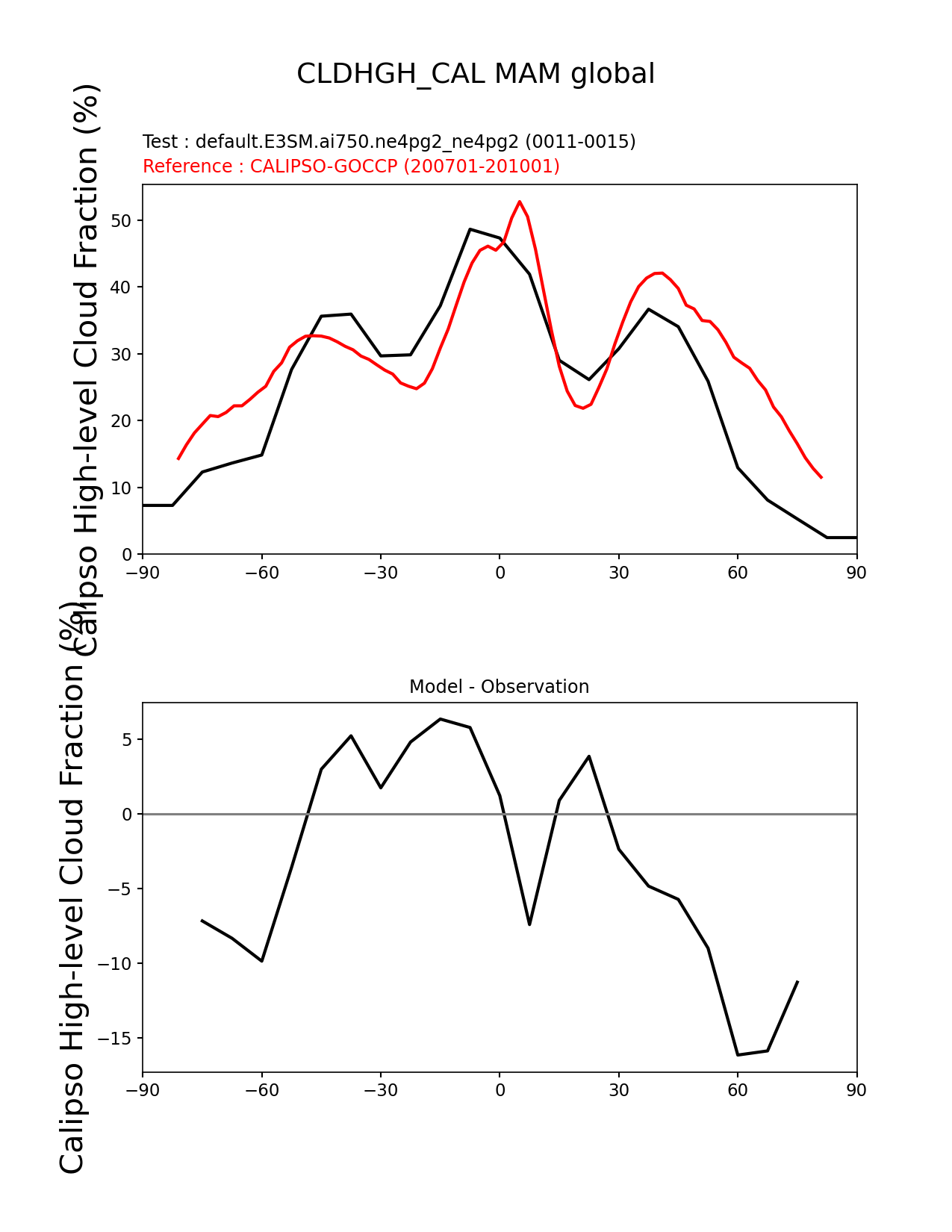 Use this command to recreate this image: | e3sm_diags zonal_mean_xy --no_viewer --case_id 'Cloud Calipso' --sets 'zonal_mean_xy' --run_type 'model_vs_obs' --variables 'CLDHGH_CAL' --seasons 'MAM' --regions 'global' --regrid_tool 'esmf' --regrid_method 'conservative' --main_title 'CLDHGH_CAL MAM global' --backend 'mpl' --output_format 'png' --canvas_size_w '1212' --canvas_size_h '1628' --figsize '8.5' '11.0' --dpi '150' --arrows --test_name 'default.E3SM.ai750.ne4pg2_ne4pg2' --test_colormap 'cet_rainbow.rgb' --ref_name 'CALIPSOCOSP' --reference_name 'CALIPSO-GOCCP' --reference_colormap 'cet_rainbow.rgb' --diff_title 'Model - Observation' --diff_colormap 'diverging_bwr.rgb' --multiprocessing --num_workers '32' --granulate 'variables' 'seasons' 'plevs' 'regions' --selectors 'sets' 'seasons' --reference_data_path '/global/cfs/cdirs/e3sm/acme_diags/obs_for_e3sm_diags/climatology/' --test_data_path '/global/cfs/cdirs/e3sm/emulate/postproc_e3sm/slice/default.E3SM.ai750.ne4pg2_ne4pg2' --results_dir '/global/cfs/cdirs/e3sm/www/wagmanbe/slice/default.E3SM.ai750.ne4pg2_ne4pg2' |